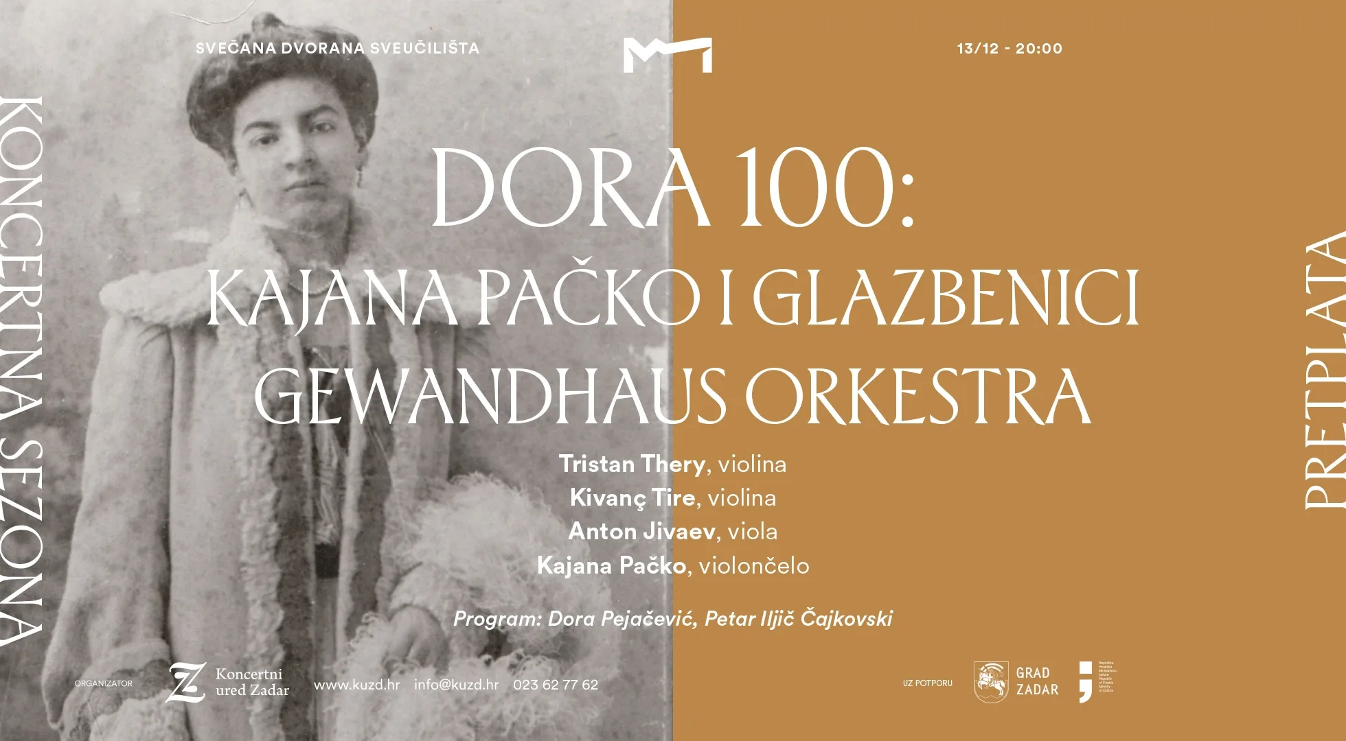 Nakon projekta Providurova Plug-in čiji je glavni motiv i inspiracija bila nezaboravna Dora Pejačević kojoj se ove godine obilježava stota godišnjica smrti, skladateljicu će glazbeno pozdraviti i sjajna hrvatska violončelistica Kajana Pačko uz međunarodne glazbene zvijezde uglednoga orkestra Gewandhaus iz Leipziga. To su francuski violinist Tristan Thery, njegov turski kolega Kivanç Tire i ruski violist Anton Jivaev!