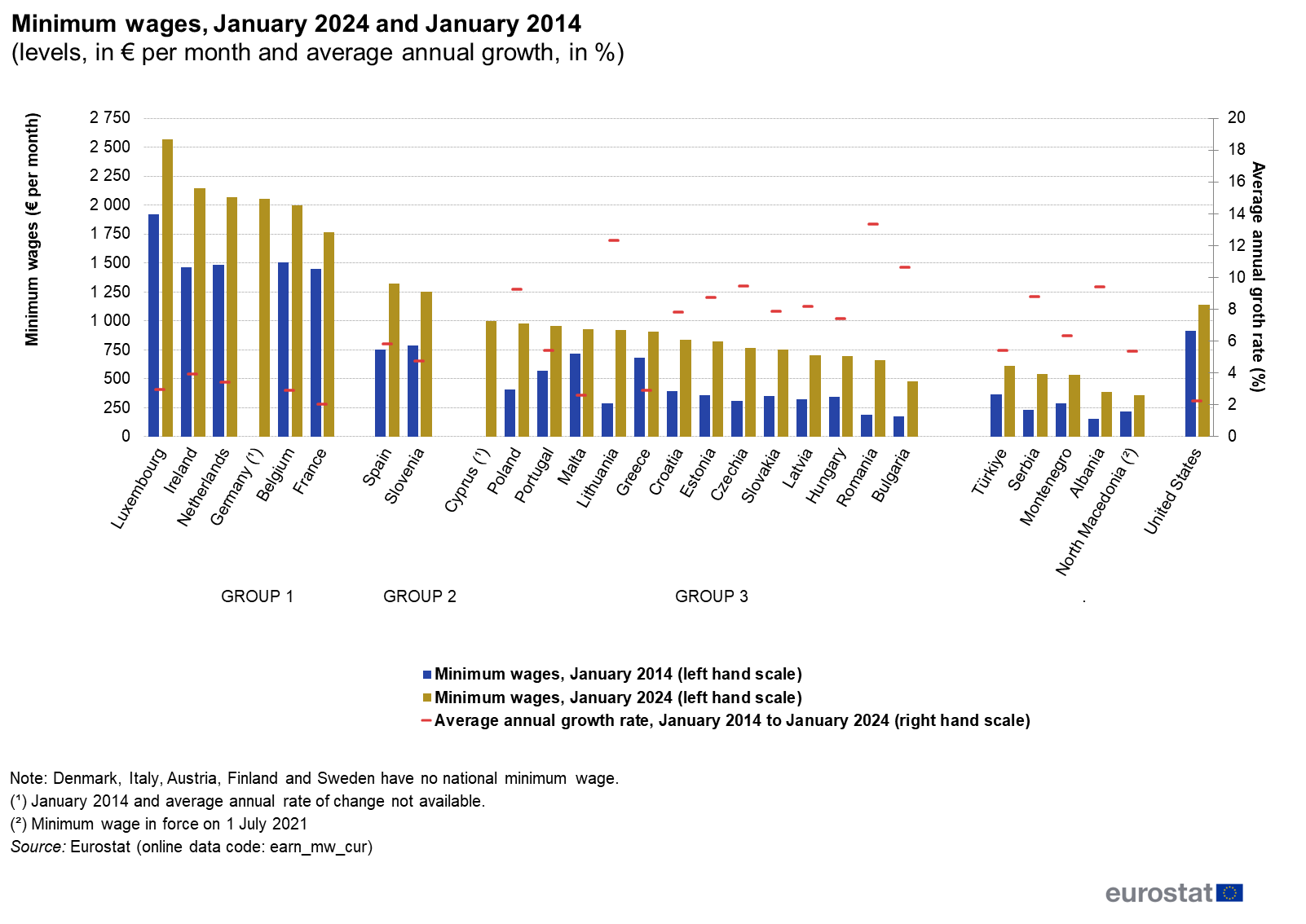 Minimalne plaće za zemlje EU-a uvelike variraju, a bruto mjesečne minimalne plaće trenutno se kreću od 477 eura u Bugarskoj do 2571 euro mjesečno u Luksemburgu.