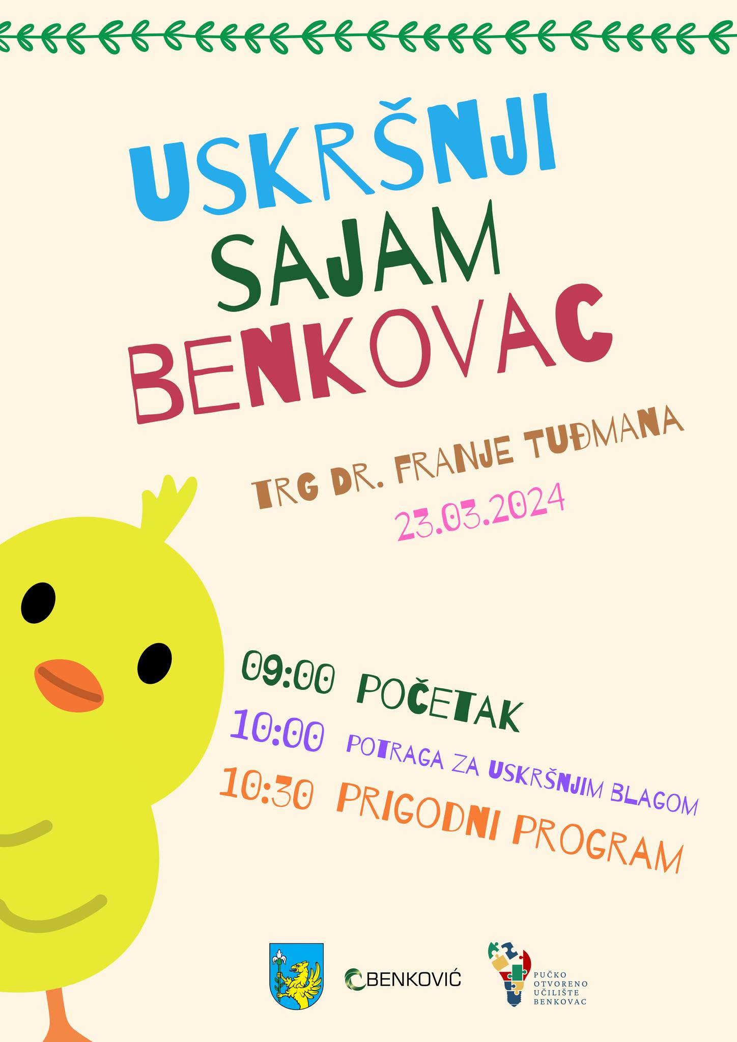 U subotu, 23. svibnja na Trgu dr. Franje Tuđmana u Benkovcu s početkom u 9:00 sati održat će se Uskršnji sajam u organizaciji Grada Benkovca, komunalnog poduzeća Benković d.o.o. i Pučkog otvorenog učilišta Benkovac.