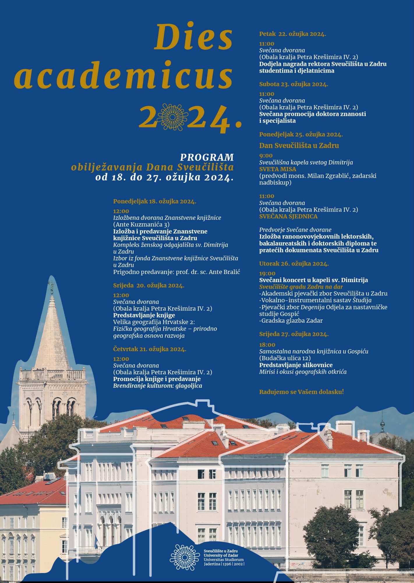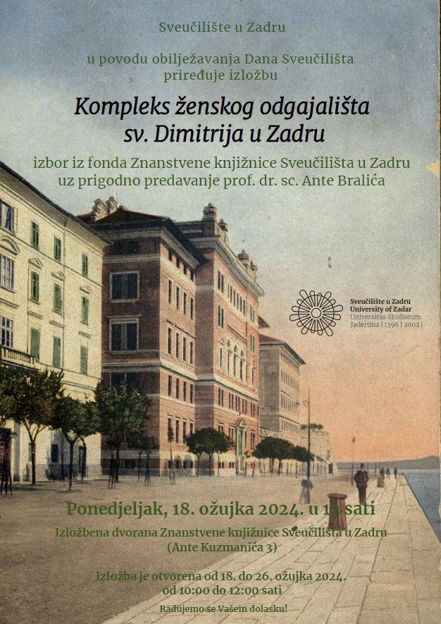 Izložbom i predavanjem „Kompleks ženskog odgajališta sv. Dimitrija u Zadru“ u Znanstvenoj knjižnici danas počinje obilježavanje Dana Sveučilišta u Zadru, koje će se odvijati od 18. do 27. ožujka 2024. godine.