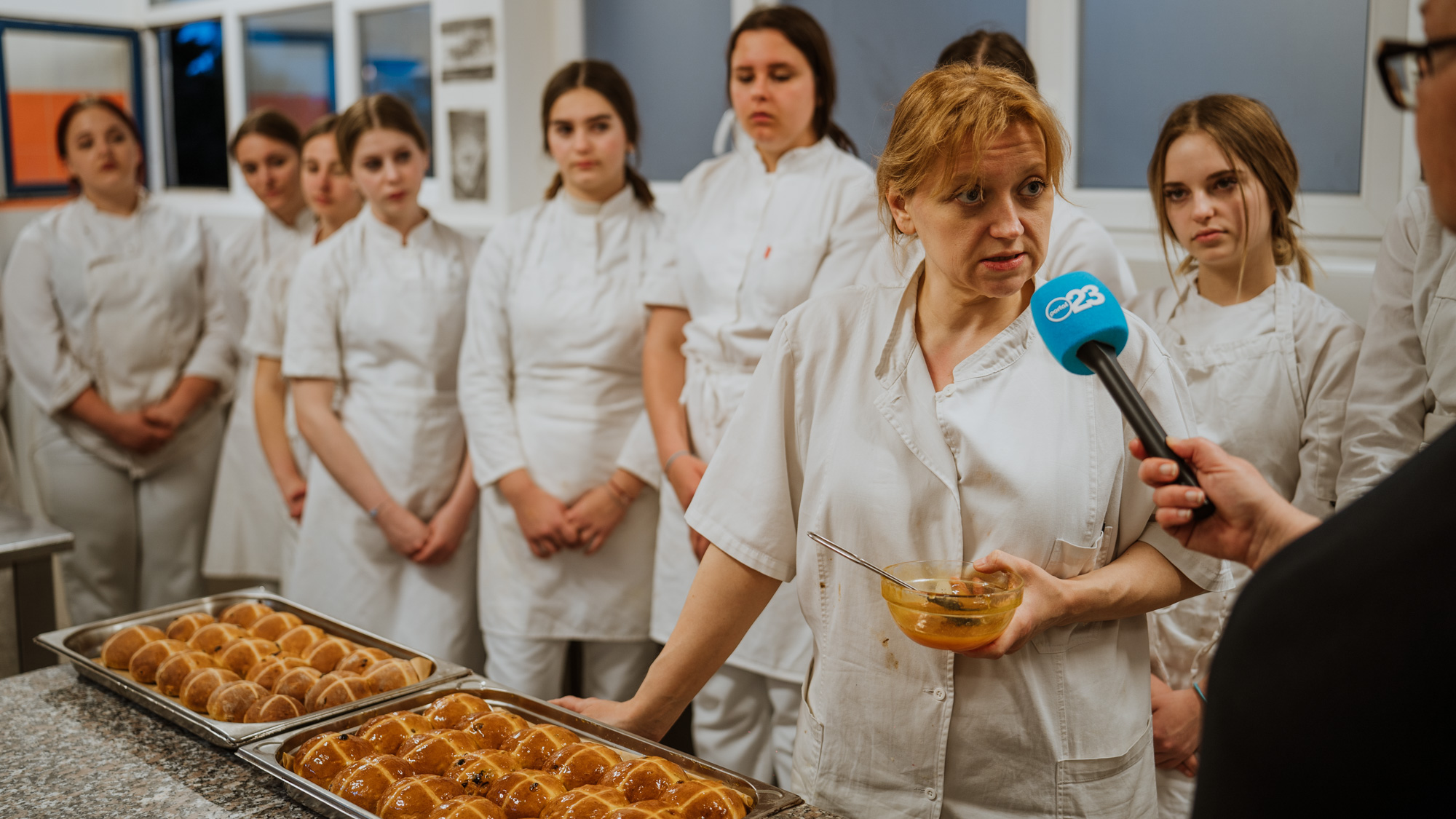 Naime, učenice 1. h razreda Hotelijersko-turističke i ugostiteljsko škole smjer slastičar, zajedno sa svojom strukovnom učiteljicom slastičarstva Kristinom Lončar, uoči blagdana ugostili su nas u školskoj slastičarnici gdje su pripremali vrlo zanimljiva britanska peciva “Hot Cross Buns” koja se tradicionalno jedu na Veliki petak.