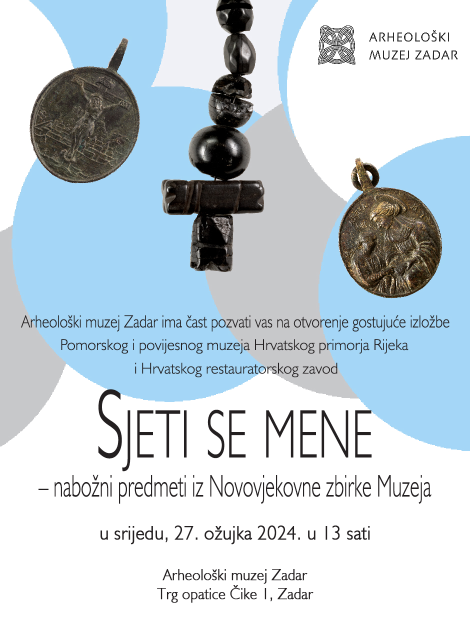 Arheološki muzej Zadar poziva na otvorenje gostujuće izložbe Pomorskog i povijesnog muzeja Hrvatskog primorja i Hrvatskog restauratorskog zavoda „Sjeti se mene – nabožni predmeti iz Novovjekovne zbirke Muzeja“ u srijedu 27. ožujka 2024. u 13 sati u Arheološkom muzeju Zadar.