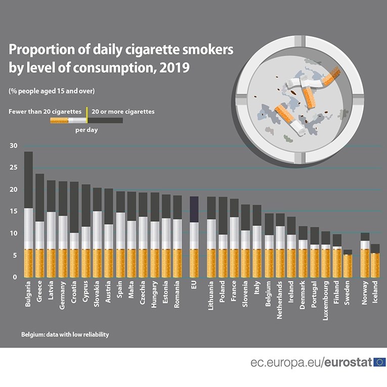 Prema Eurostatu, u Hrvatskoj je 2024. pušilo oko 21.8% stanovnika. Od toga 10.2% manje od 20 cigareta dnevno, a 11.6% više od 20.