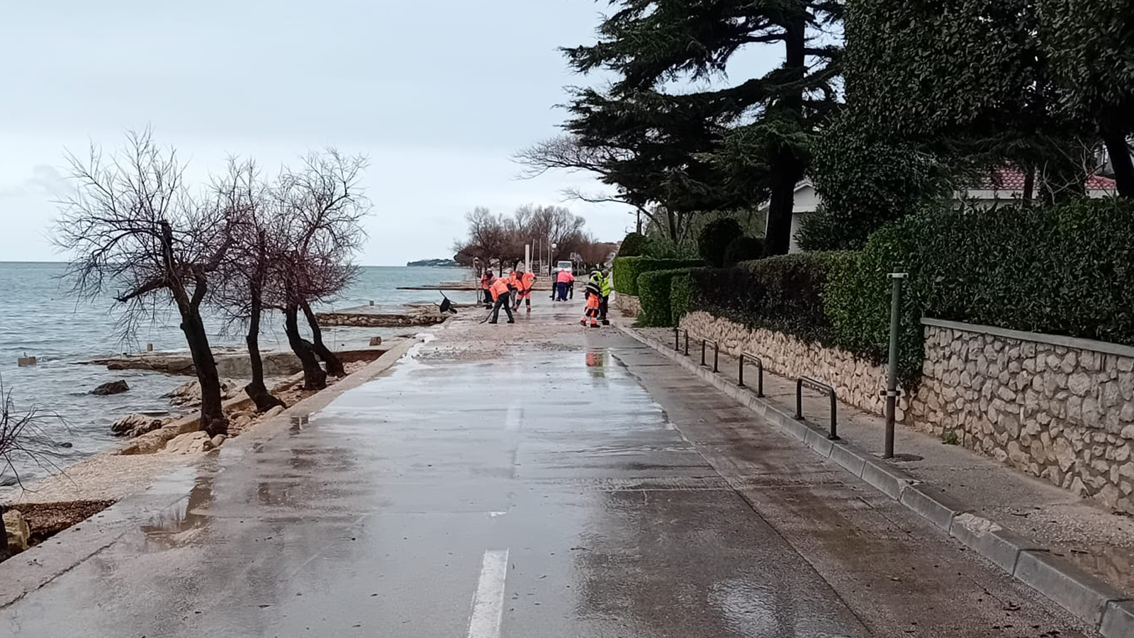 Uslijed snažnog juga, more je na nekim lokacijama nanijelo šljunak na pješačke staze i prometnice. Trpimirova obala je tijekom noći bila zatvorena za sav promet radi sigurnosti građana. Cestovne ekipe su promptno reagirale, čisteći prometnice i vraćajući izbijene šahtove, osiguravajući normalno kretanje vozila. Sve prometnice su sada prohodne.