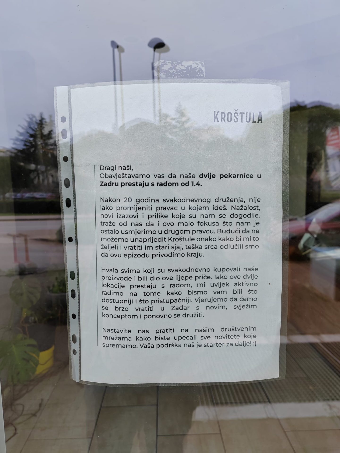 Nakon 20 godina uspješnog poslovanja i svakodnevnog stvaranja slasnih delicija, pekarnica “Kroštula” vlasnika Karla Vulina, odlučila je zatvoriti svoje dvije poznate pekarnice u srcu Zadra.