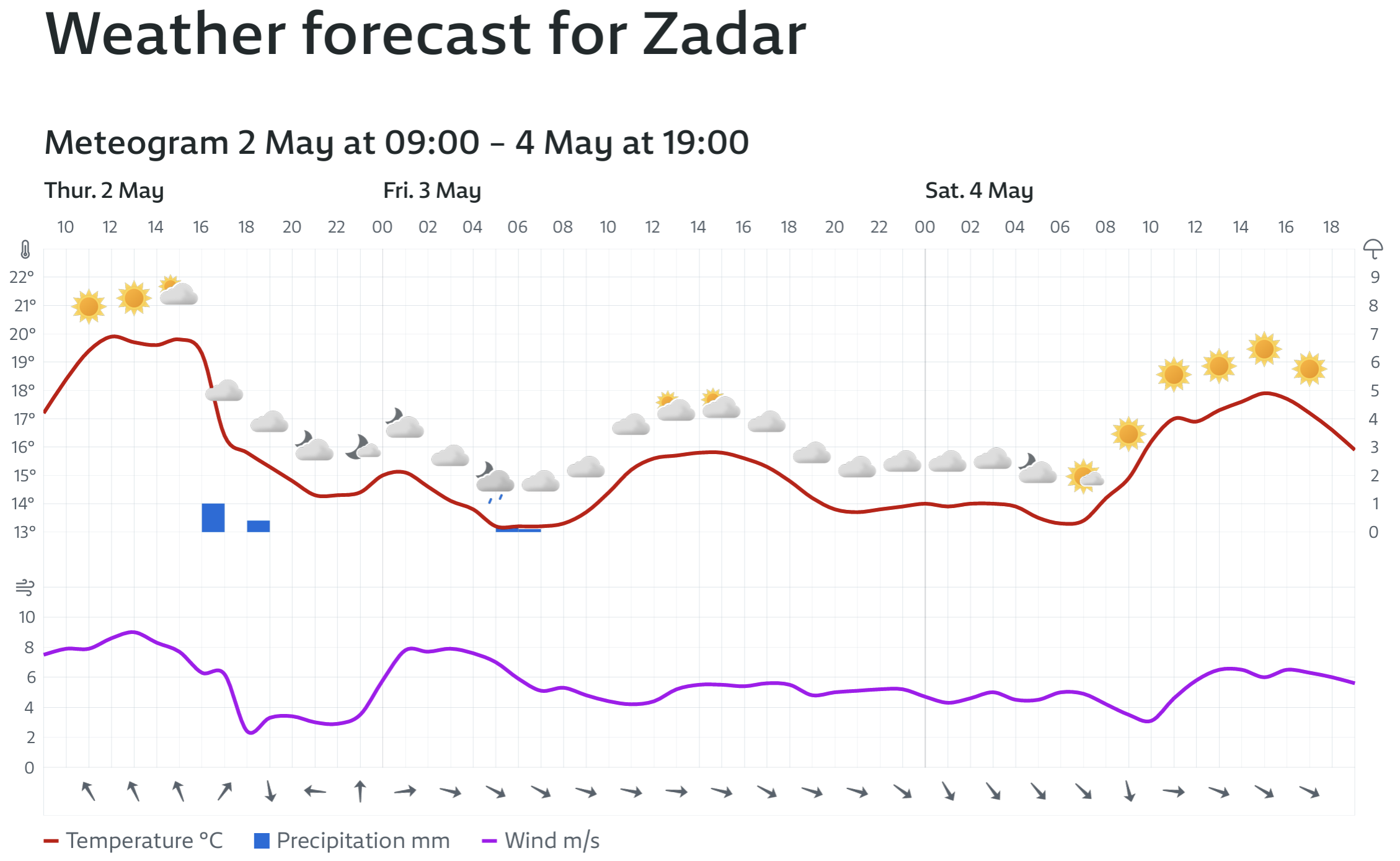 I dalje promjeljivo i nestabilno mjestimice s kišom i pljuskovima, koji ponegdje mogu biti i jače izraženi. Vjetar slab do umjeren zapadni i jugozapadni, na moru i sjeverozapadni. Jutarnja temperatura od 7 do 12, na moru između 11 i 14, a najviša dnevna uglavnom od 16 do 21 °C, navode iz DHMZ-a.
