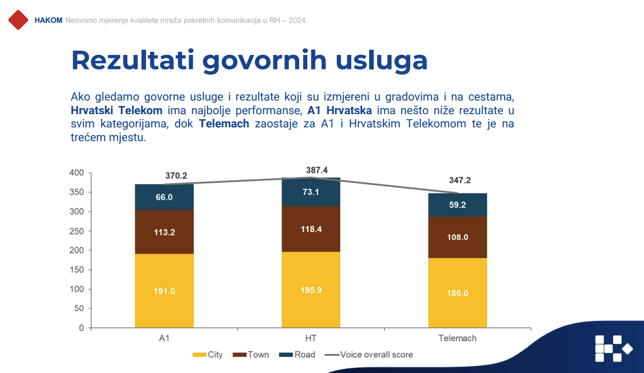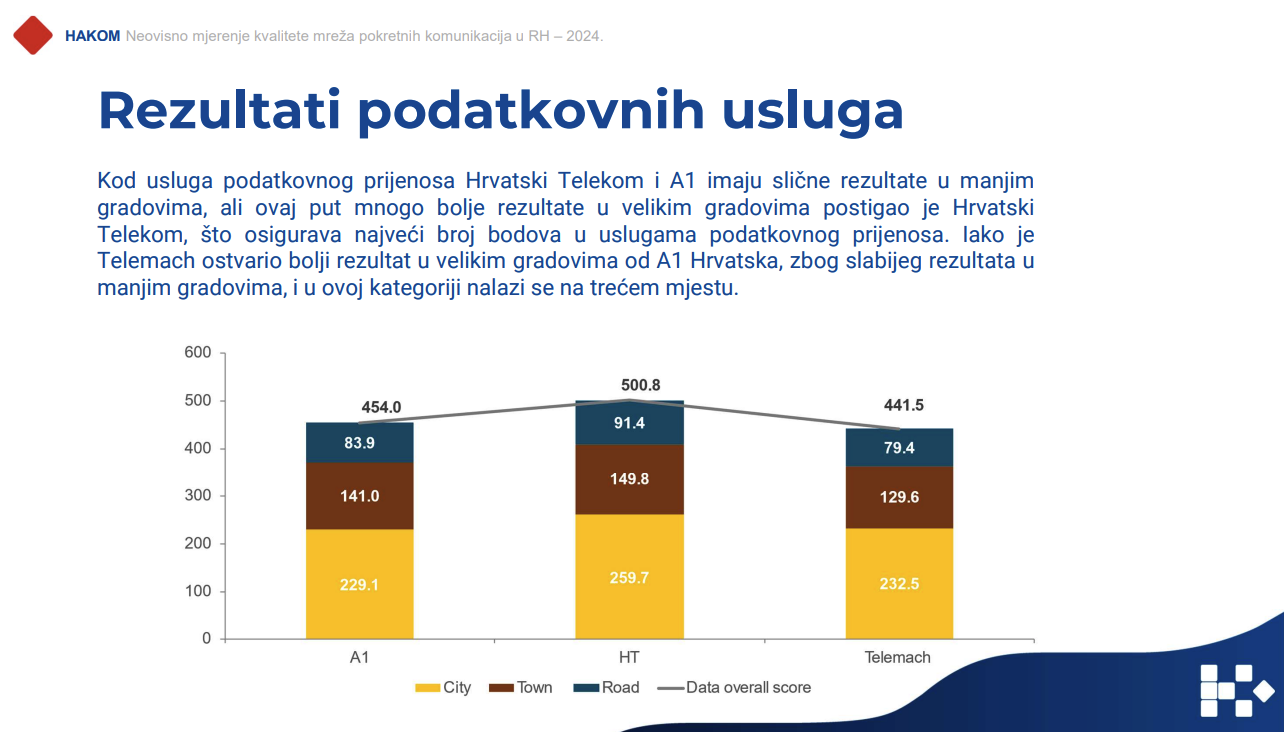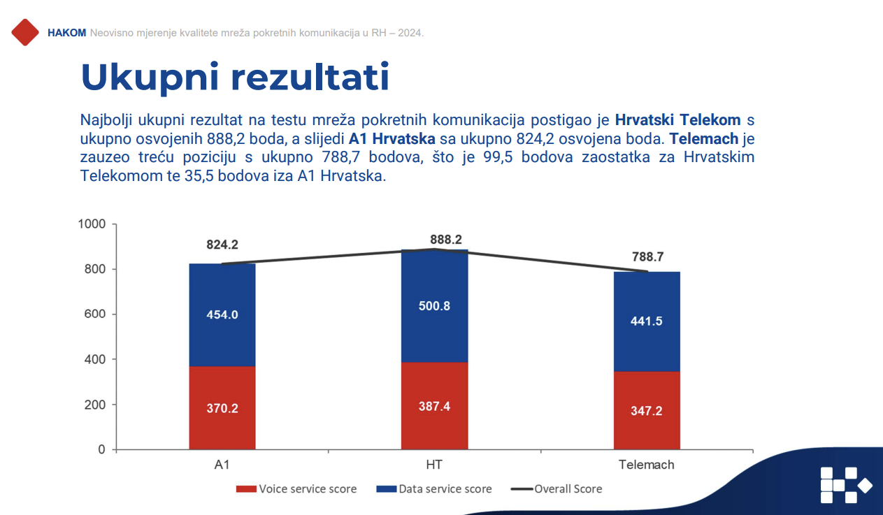 Prema podacima koje je HAKOM objavio, najbolji ukupni rezultat na testu mreža pokretnih komunikacija postigao je Hrvatski Telekom s ukupno osvojenih 888,2 boda, a slijedi A1 Hrvatska sa ukupno 824,2 osvojena boda, dok je Telemach zauzeo treću poziciju s ukupno 788,7 bodova.