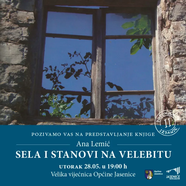 U utorak, 28. svibnja u 19 sati u velikoj vijećnici Općine Jasenice bit će održano predstavljanje knjige prof. Ane Lemić s naslovom “Sela i stanovi na Velebitu”, podnaslova “Svjedočanstva života od postanka do nestanka”.