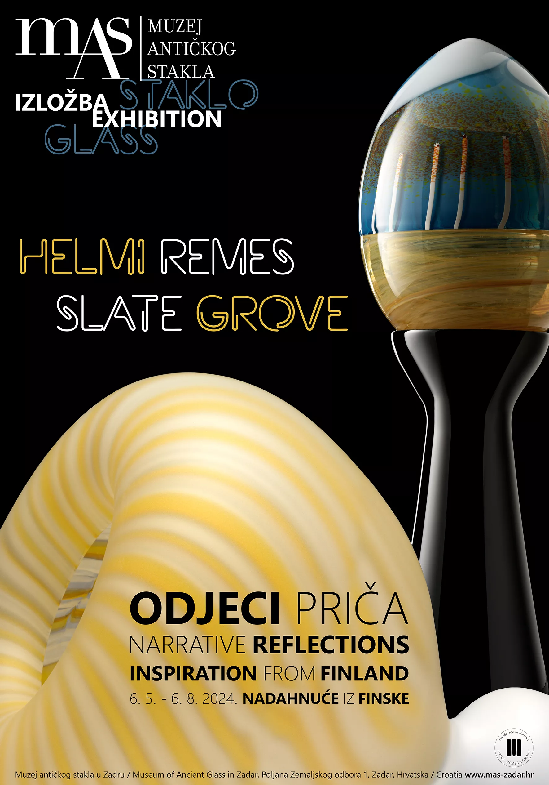 Muzej antičkog stakla u Zadru bogatom programu obilježavanja 15. godina od otvorenja dodaje i izložbu Helmi Remes i Slate Grove “Odjeci priča / Nadahnuće iz Finske”. To je izložba dvoje umjetnika iz Finske, Helmi Remes, rođene Finkinje i Slate Grovea, Amerikanca koji živi u Finskoj.