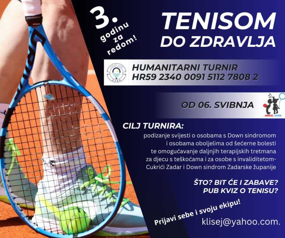 Ovogodišnji turnir Tenisom do zdravlja počinje 6. svibnja 2024., a sudionike turnira i finaliste ćemo bodriti dva tjedna. Cilj ovogodišnjeg turnira je podizanje svijesti o osobama s Down sindromom i osobama oboljelima od šećerne bolesti te omogućavanje daljnjih terapijskih postupaka za članove Udruge za Down sindrom Zadar i Udruge Cukrići Zadar.