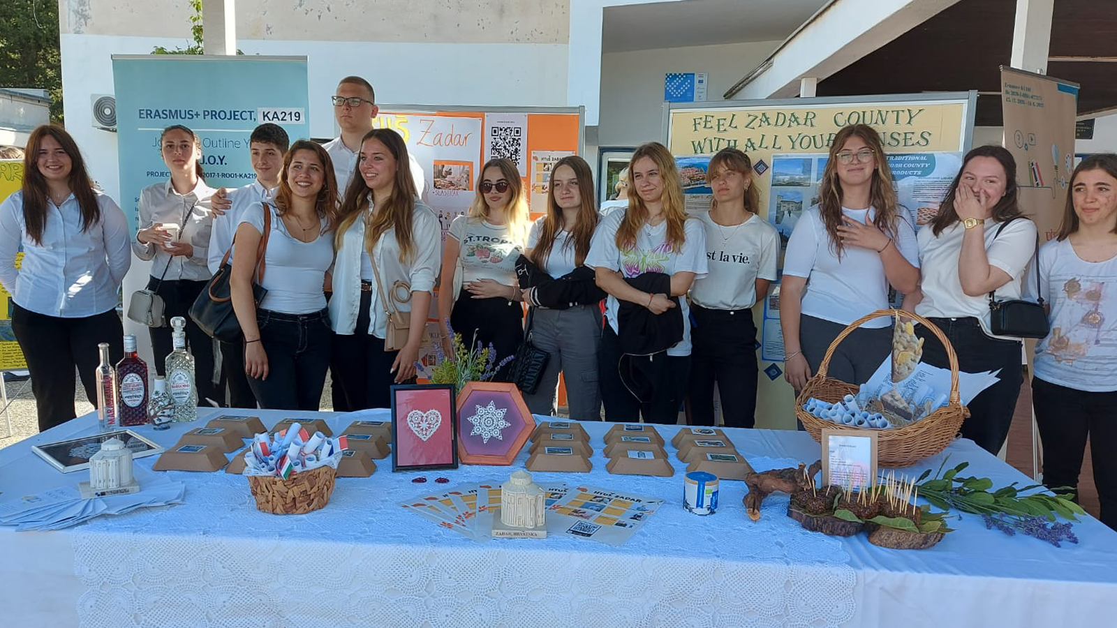 Učenici hotelijerske grupe predmeta postavili su štand sa tradicionalnim zadarskim proizvodima, povijesno-kulturnom baštinom na stranim jezicima koji se uče u školi (engleski njemački, francuski, talijanski i španjolski).