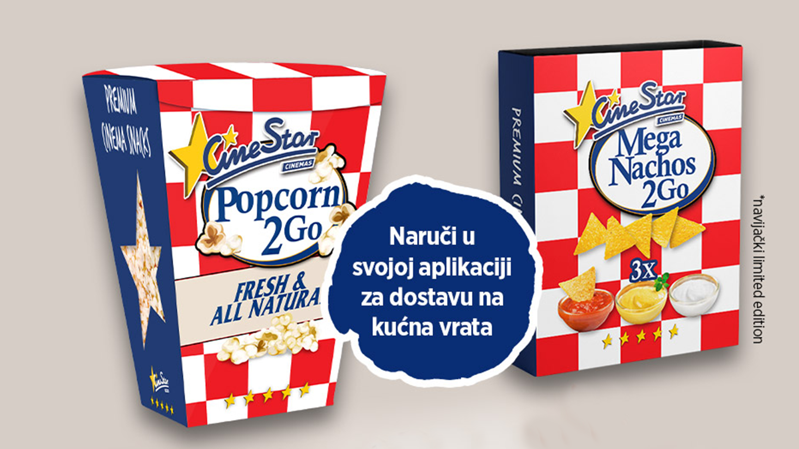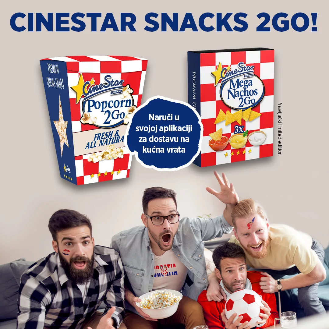 Navijačke limited edition grickalice 2GO potraži na blagajnama CineStara i putem aplikacija za narudžbu dostave! Naruči preko Glovo ili Wolt aplikacije.