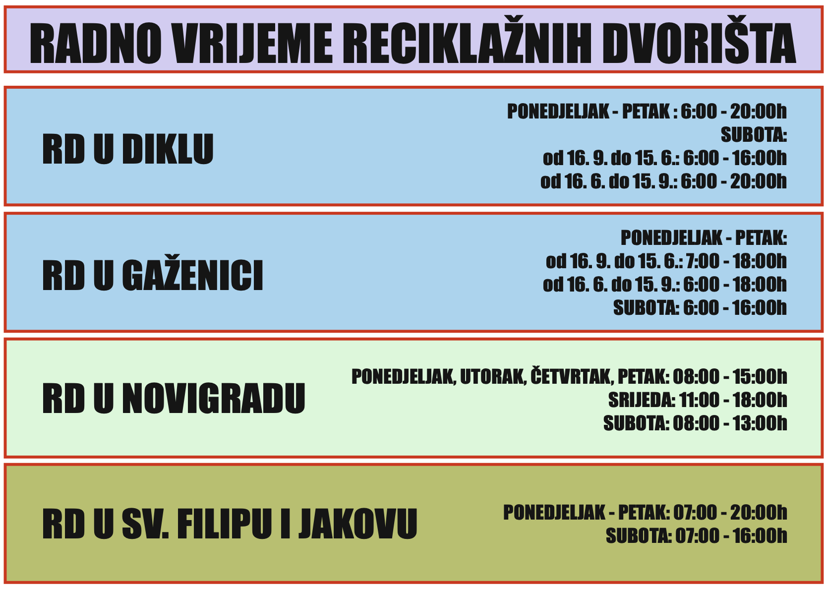 Reciklažno dvorište otvoreno je: (ponedjeljak – petak 06:00-20:00 sati, subotom 06:00-16:00 sati.
