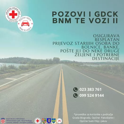 Kroz projekt “Pozovi i GDCK BnM te vozi II”, kojeg provodi Gradsko društvo Crvenog križa Biograd na Moru, u partnerstvu s Gradom Biogradom na Moru te Općinama Pakoštane i Sveti Filip i Jakov, u prvoj polovici 2024. godine prijeđeno je preko 10.700 km.