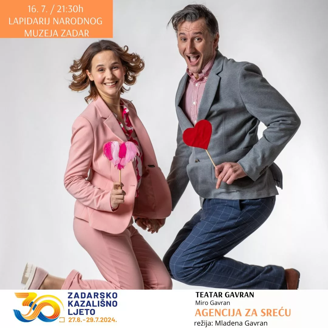 Sutra, 16. srpnja na 30. Zadarskom kazališnom ljetu pogledajte neobičnu romantičnu komediju Teatra Gavran “Agencija za sreću” koju je napisao poznati hrvatski autor Miro Gavran. Režiju potpisuje Mladena Gavran. Predstava će se održati u lapidariju Narodnog muzeja Zadar s početkom u 21:30 sati. Igraju: Nevena Vukes, Mirel Huskić i Mladena Gavran.