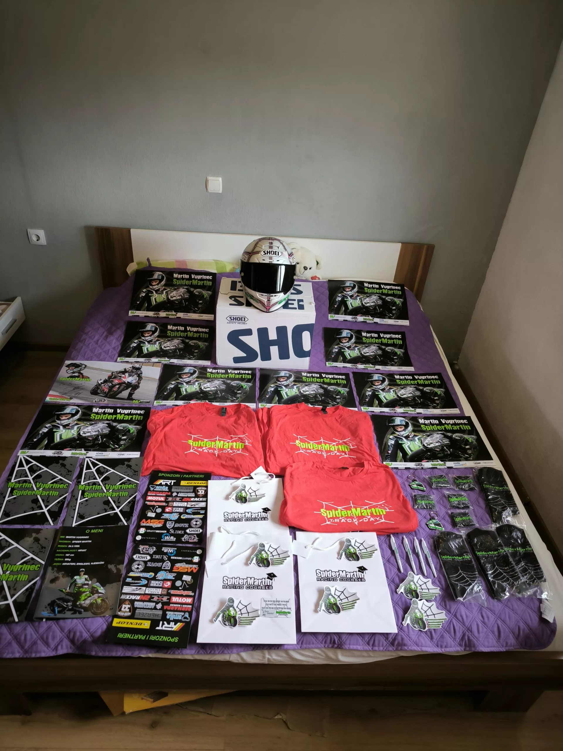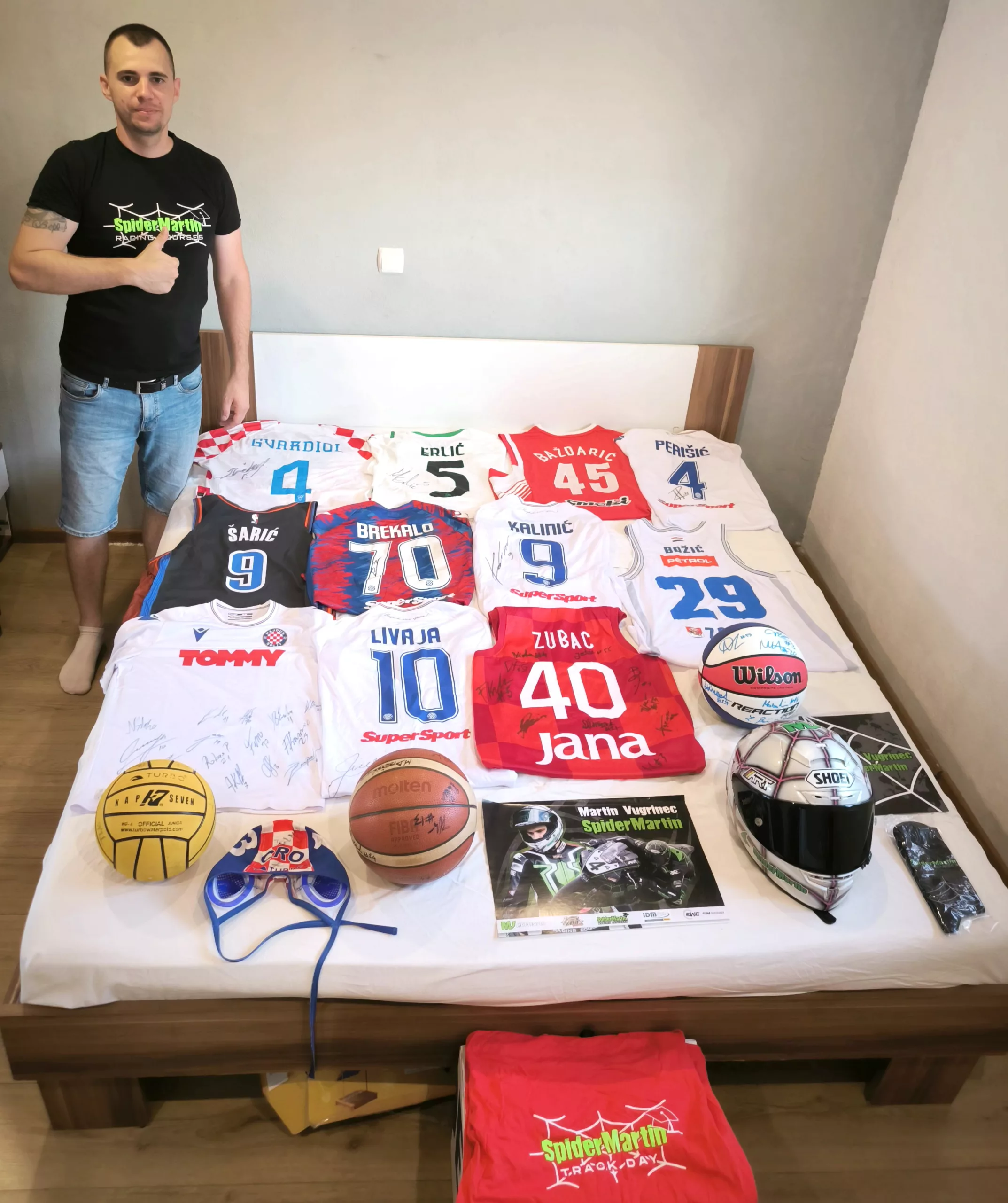 U jednom od paketa je kaciga Martina sa svjetskom prvenstva FIM endurance koja je u dućanu 850eura a ovo je baš njegova nošena. Personalizirana sa svim sponzorima a i “ožiljcima”. Otvaram drugi a u paketu majice, kemijske, privjesci, plakati, sve skupa 50ak predmeta!!! Nisam mogao vjerovati što su sve poslali. Inače Martin je trenutno najbrži Hrvatski moto vozač koji vozi od Hrvata najprestižnija natjecanja kao IDM,ESBK,FIM endurance i mnoga ostala a prošao je i moto GP Rookies Cup. Ni to nije sve jer stiže dres Krune Simona i Bojana Bogdanovića od reprezentacije. Za većinu predmeta je zaslužan Antonio Duka skupa sa ljudima koji su mu pomogli i ja im se zahvaljujem ovim putem. Inače dres Marka Livaje je na kraju stigao među zadnjima. Htjeli smo doći do nošenog dresa koji će potpisati ali nakon sezone to je teško. Mislili smo čekati novu i onda to realizirati ali ja sam nestrpljim i odlučio sam kupiti original dres i riješiti potpis. Tako sam i učinio a po potpis išao sa Željkom Žužom u Split na otovreni trening i tu “uhvatio” Livaju. Svi dresovi su potpisani i original. Neki nošeni, neki ne, ali uglavnom dobijeni direkt od igrača. Trebali bi tokom idućeg mjeseca još doći od Modrića, Petkovića i Livakovića ali to još ništa nije sigurno. Jedan dio dresova će ići na aukciju na samom događaju 25.08 u Paljuvu,jedan dio preko mog profila a dio Hajdukovih dresova preko stranice “niko kao Hajduk iz Splita 1950” koje prati skoro 100 000 što Facebook što Instagram i ovim putem im se zahvaljujem, objasnio je Baraba.