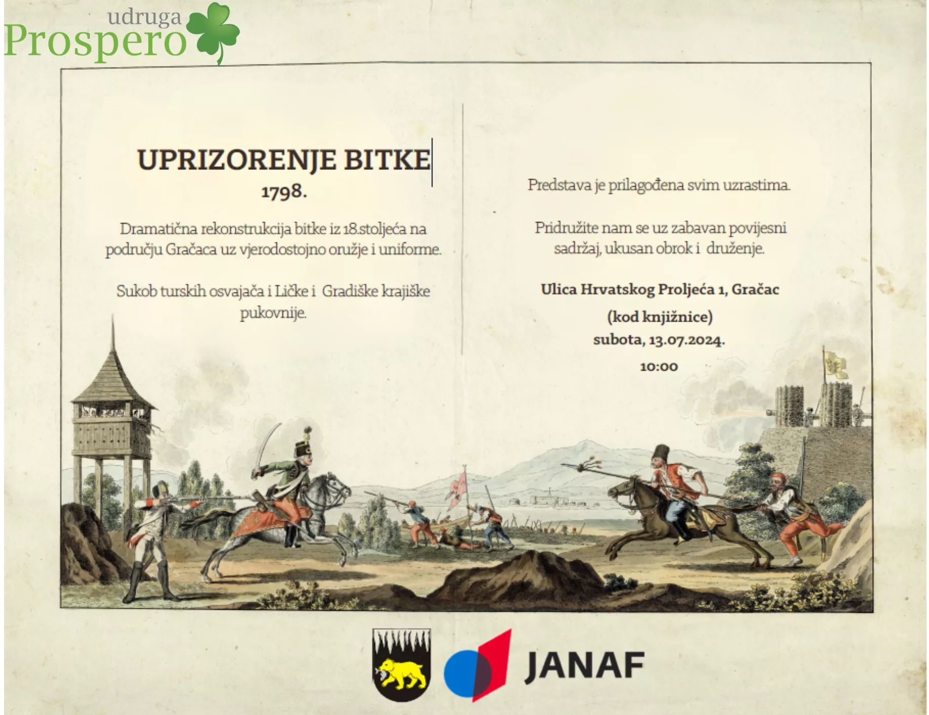 U subotu, 13.07.2024. godine, u 10 sati, na livadi pokraj Knjižnice i čitaonice Gračac bit će uprizorenje bitke 1798.