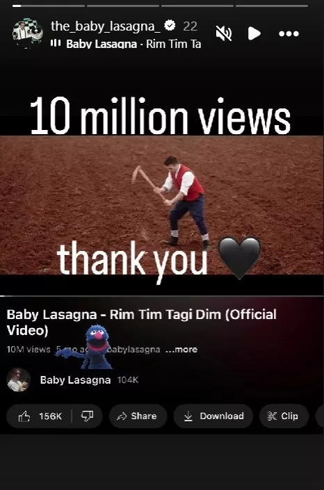 Spot za pjesmu Rim Tim Tagi Dim, s kojom je Baby Lasagna predstavljao Hrvatsku na ovogodišnjem Eurosongu, skupio je 10 milijuna pregleda na YouTubeu u pet mjeseci.