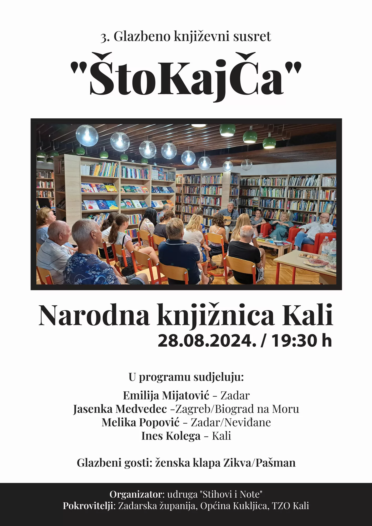 U Narodnoj knjižnici Kali ovu srijedu, 28. kolovoza s početkom programa u 19:30 održat će se 3. Glazbeno književni susret “ŠtoKajČa” na kojem će se okupit pjesnici koji će predstaviti Hrvatsku jezičnu baštinu štokavicu, kajkavici i čakavicu “Zlatnu formulu hrvatskoga jezika ča-kaj-što“, kulturno dobro Ministarstva kulture RH koju ustrajno promiče i svehrvatska jezično-pjesnička smotra Croatia rediviva ča-kaj-što u Selcima na otoku Braču.