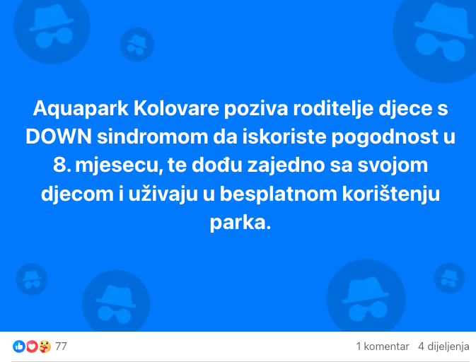 Aquapark Kolovare poziva roditelje djece s Down sindromom da iskoriste posebnu pogodnost tijekom mjeseca kolovoza. Kroz cijeli osmi mjesec djeca mogu uživati u besplatnom korištenju aquaparka. Ova inicijativa omogućava obiteljima kvalitetno vrijeme provedeno zajedno uz zabavu i opuštanje u vodenim atrakcijama aquaparka.