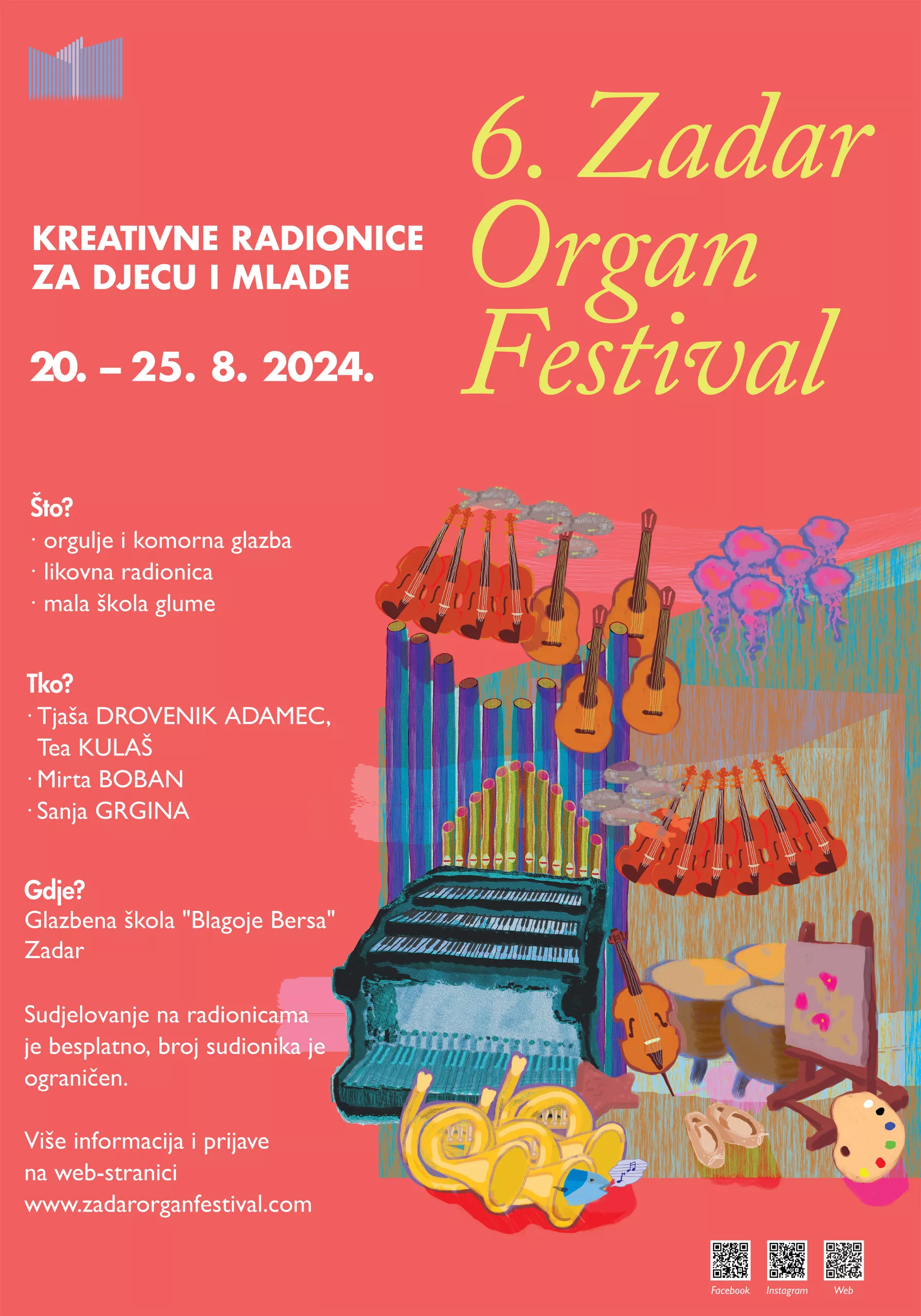 Glazbene radionice i ove će godine voditi osnivačica i voditeljica Zadar Organ Festivala, orguljašica i muzikologinja Tea Kulaš, kao i slovenska orguljašica Tjaša Drovenik Adamec. Likovnu radionicu vodit će zadarska slikarica Mirta Boban, dok će malu školu glume voditi naša poznata umjetnica Sanja Grgina. Sve radionice će se održavati u Glazbenoj školi Blagoje Bersa Zadar.