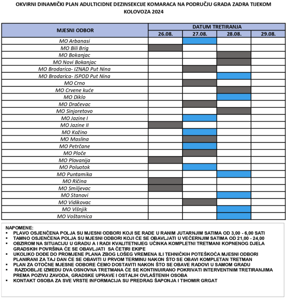 Zaprašivanje će se provoditi u terminima između 26. i 29. kolovoza, ovisno o kvartu, u jutarnjem ili večernjem terminu.