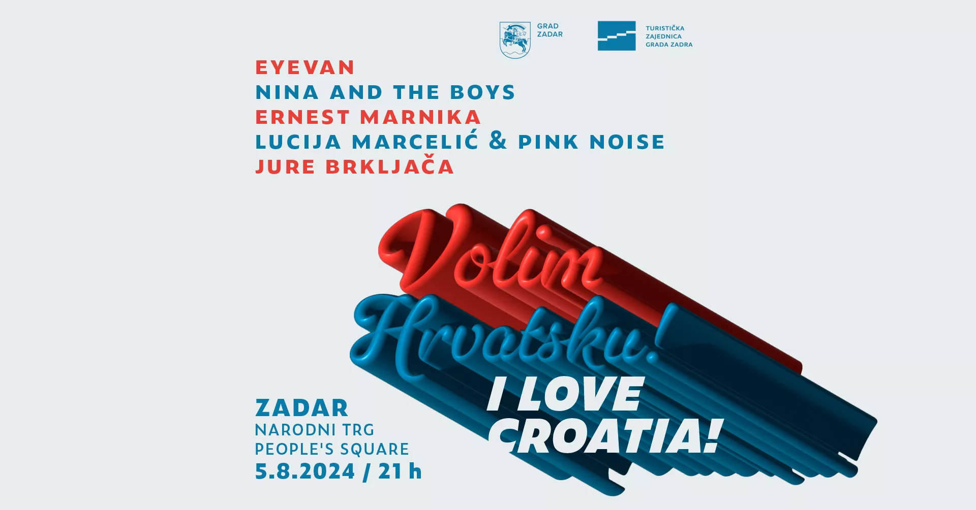 Na Dan pobjede i domovinske zahvalnosti i Dan hrvatskih branitelja 5. kolovoza, Narodni trg u Zadru postat će pozornica za koncert pod nazivom “Volim Hrvatsku” na kojem će nastupiti talentirani mladi zadarski izvođači. Koncert počinje u 21 sat, a posjetitelji će moći uživati u raznolikom glazbenom repertoaru uz besplatan ulaz.