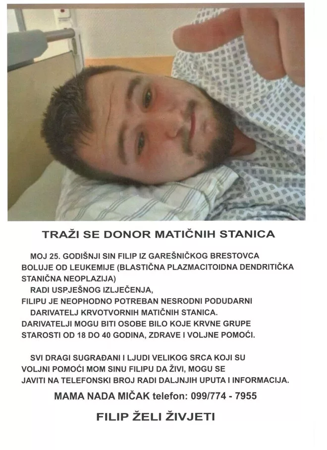Umjesto da razmišlja gdje će izaći sljedećeg vikenda, na što će potrošiti svoju plaću ili kada će upoznati djevojku svojega života, Filip Vlaović, 25-godišnji mladić čiji korijeni su u Garešničkom Brestovcu, a koji živi u Njemačkoj, ima sasvim druge brige. Liječi se u njemačkoj bolnici svjestan težine dijagnoze koju je krajem srpnja dobio – rijetka vrsta leukemije, blastična plazmacitoidna dendritička stanična neoplazija, plus Hodgkinov limfom. Za Filipovo izlječenje potreban je nesrodni podudarni donor krvotvornih matičnih stanica. I to ne jedan donor, već čak tri.
