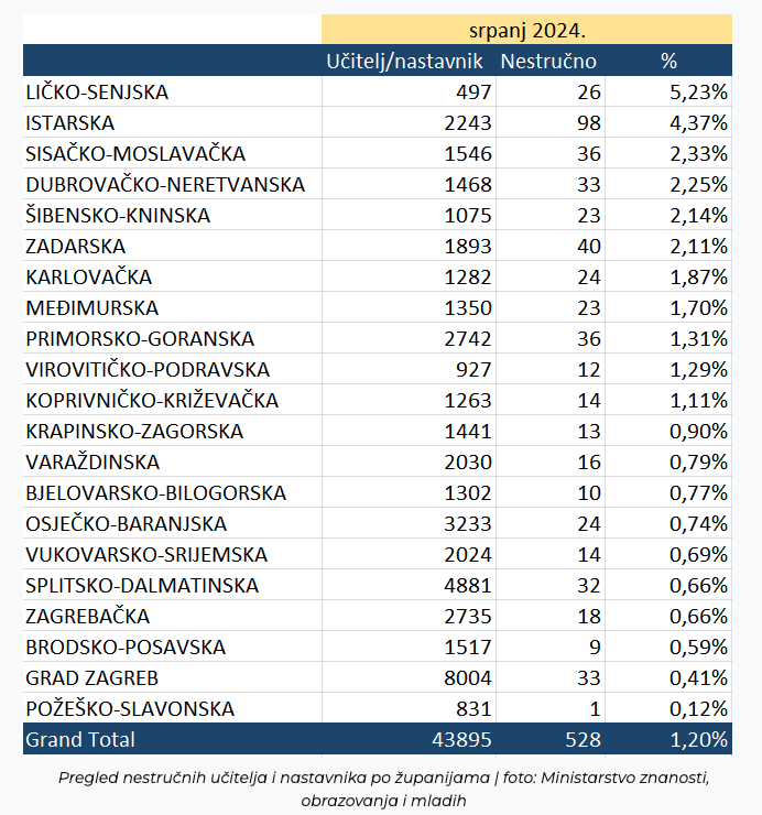 Najviše nestručnih nastavnika u omjeru prema ukupnom broju jest u Ličko-senjskoj županiji. Tamo je zaposleno 5,23 posto nestručnih učitelja i nastavnika. Slijedi Istarska županija s postotkom od 4,37, a treća je Sisačko-moslavačka županija s 2,33 posto. Na dnu ljestvice je Požeško-slavonska županija gdje je zaposlen tek jedan nestručni nastavnik, što je u postotku prema ukupnom broju nastavnika 0,12 posto. Manji broj zaposlenih učitelja i nastavnika bez odgovarajuće vrste obrazovanja je i u Gradu Zagrebu s 0,41 posto i Brodsko-posavskoj županiji s 0,59 posto u odnosu na cjelovit broj učitelja i nastavnika.