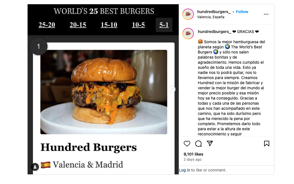 Hundred Burgers, valencijanski restoran s hamburgerima, 2020. godine osnovali su Alex González-Urbón i Ezequiel Maldjian. Izdvaja se po svom zanatskom pristupu i stalnoj evoluciji u potrazi za savršenstvom u pripremi burgera.