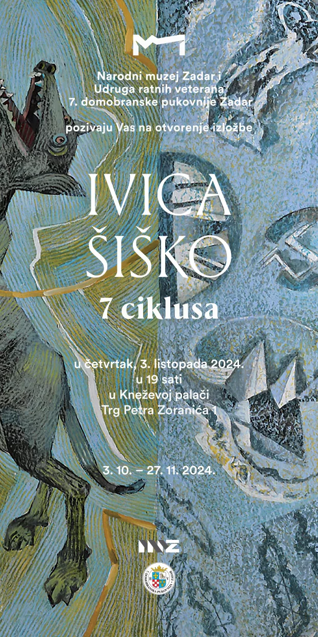 Narodni muzej Zadar i Udruga ratnih veterana 7. domobranske pukovnije Zadar pozivaju na otvorenje izložbe “Ivica Šiško 7 ciklusa” koja se održava u povodu obilježavanja Dana obrane grada Zadra u četvrtak, 3. listopada 2024. godine u 19 sati u Izložbenim dvoranama Kneževe palače.