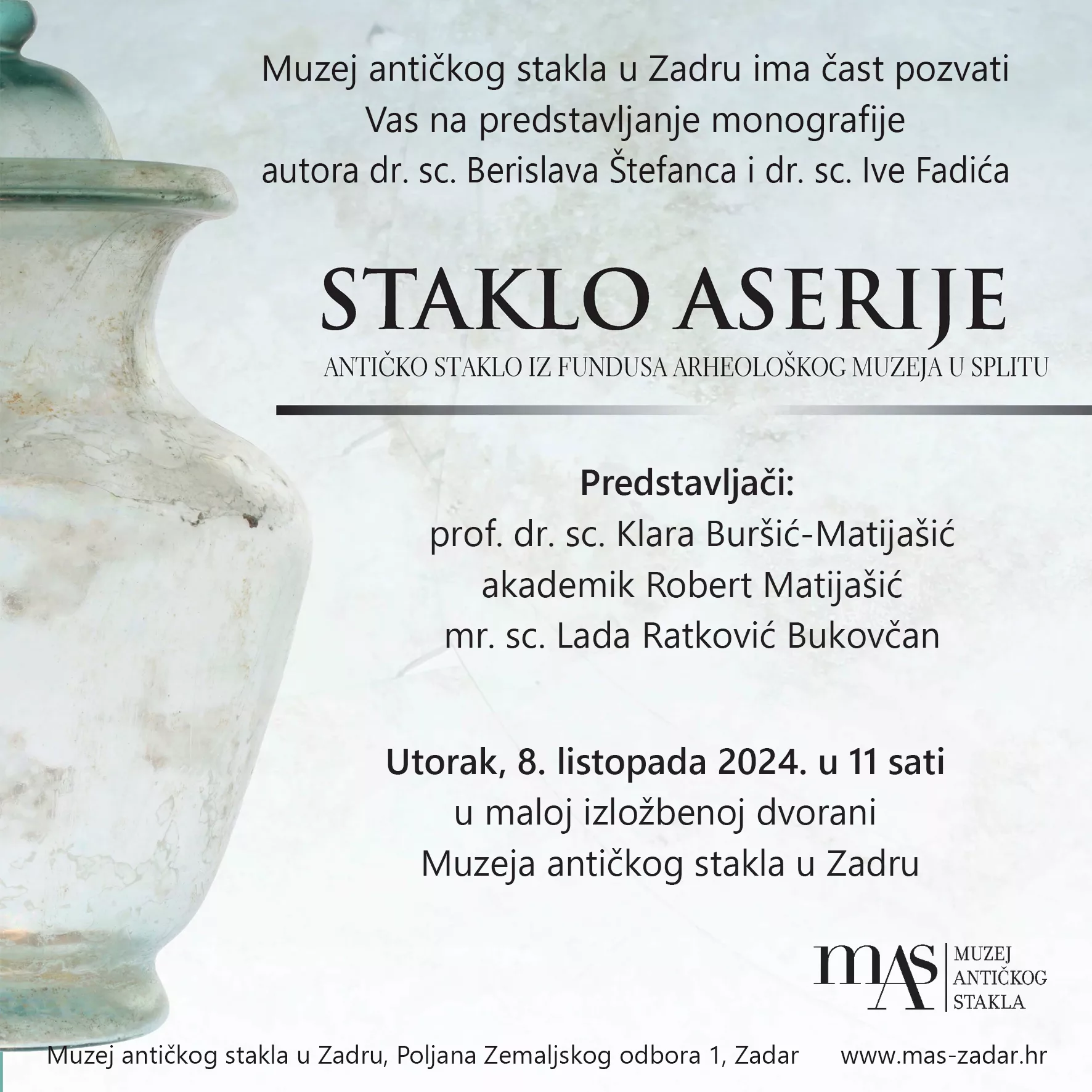 Predstavljanje monografije “Staklo Aserije – Antičko staklo iz fundusa Arheološkog muzeja u Splitu” bit će održano u maloj multimedijalnoj dvorani Muzeja antičkog stakla u Zadru u utorak, 8. listopada 2024. u 11 sati, najavili su iz Muzeja.