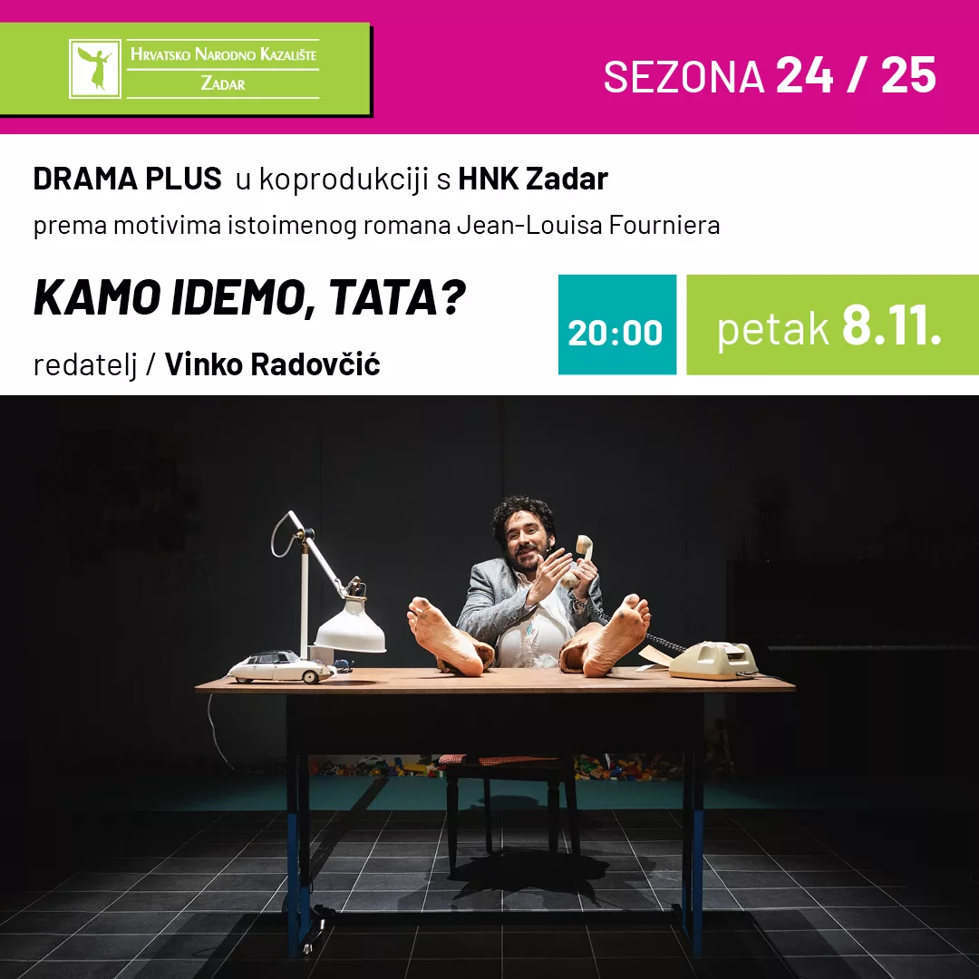 Večeras, 8. studenog s početkom u 20 sati u HNK Zadar pogledajte predstavu KAMO IDEMO, TATA? u režiji Vinka Radovčića. Nastala u koprodukciji Drame Plus i HNK Zadar ova predstava inspirirana je motivima istoimenog romana Jean-Louisa Fourniera te donosi dirljivu i potresnu priču o očinskoj ljubavi, izazovima i svakodnevici roditeljstva. Svoju premijeru imala je na 30. Zadarskom kazališnom ljetu, 22.srpnja u Kazalištu lutaka Zadar.
