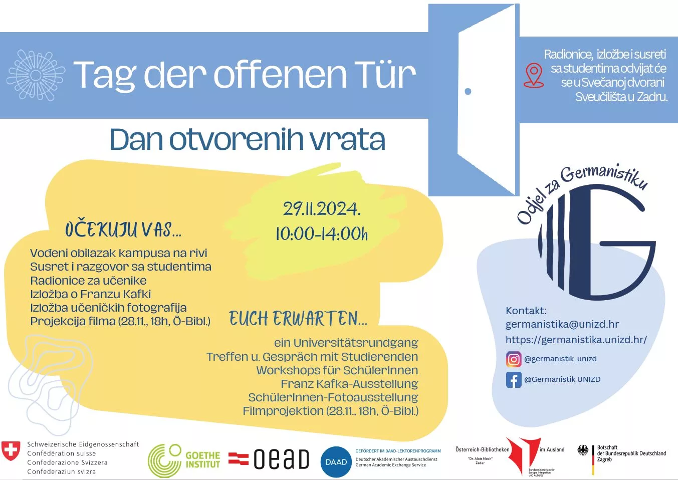 U okviru obilježavanja Dana grada Zadra, u petak 29. studenog 2024. od 10 do 14 sati Odjel za germanistiku Sveučilišta u Zadru organizira Dan otvorenih vrata.