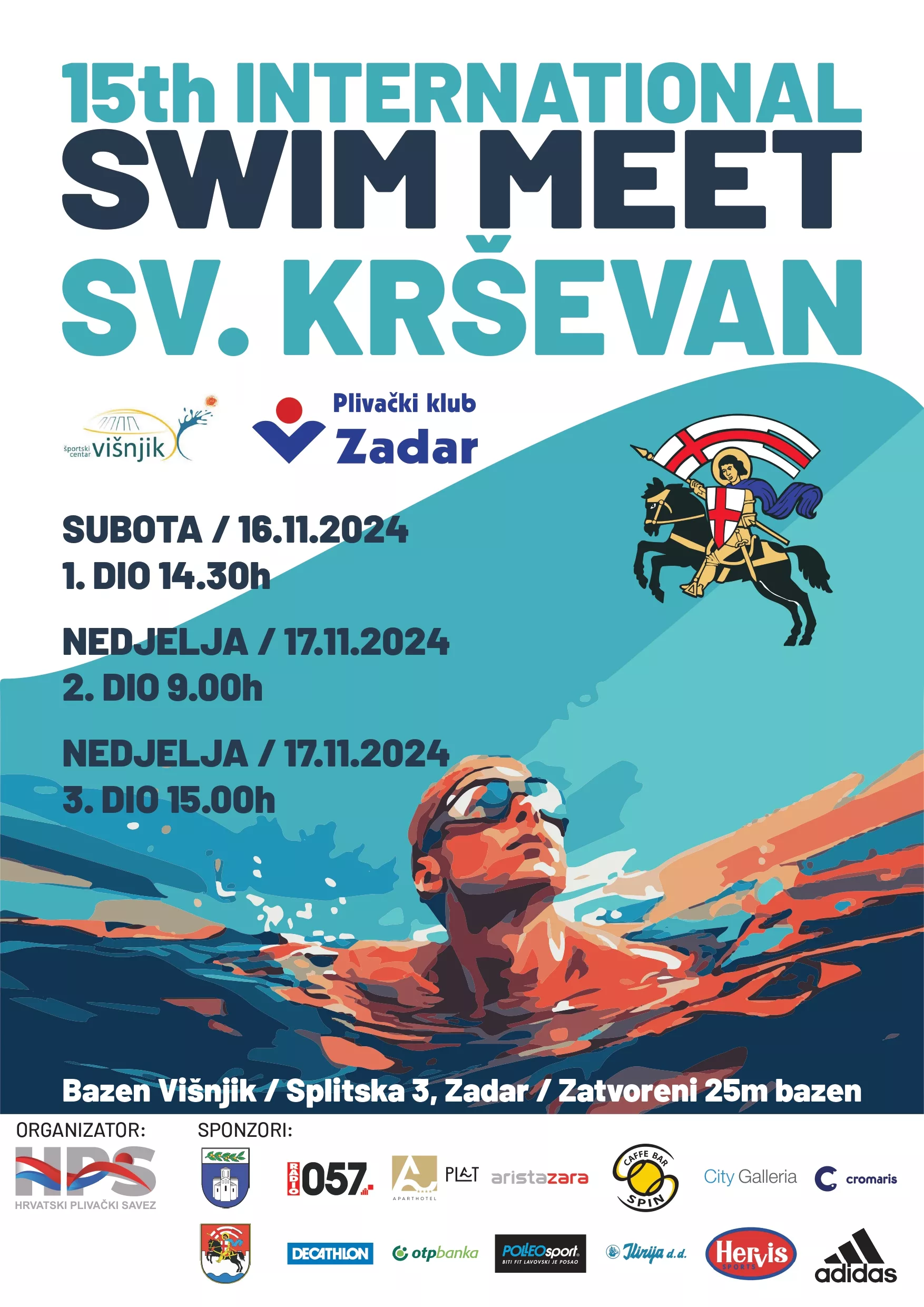 Povodom obilježavanja Dana grada Zadra i blagdana njegova zaštitnika Sv. Krševana, na bazenu Športskog centra Višnjik 16. i 17. studenoga 2024. održat će se 15. međunarodni plivački miting “Sveti Krševan” u organizaciji Plivačkog kluba Zadar.
