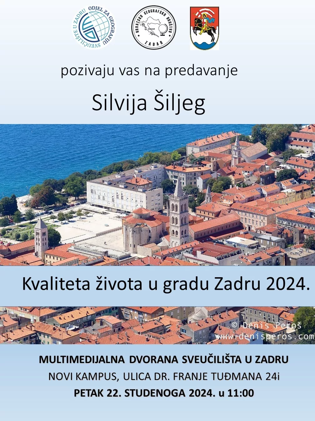 Silvija Šiljeg održat će 22. studenog u 11 sati u Novom kampusu predavanje pod nazivom “Kvaliteta života u gradu Zadru 2024.” u organizaciji Hrvatskog geografskog društva – Zadar, Odjel za geografiju Sveučilišta u Zadru, Centar za geoprostorne tehnologije i Grad Zadar.