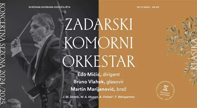 U utorak, 19. 11. s početkom u 20 sati u Svečanoj dvorani Sveučilišta nastupit će Zadarski komorni orkestar pod dirigentskom palicom Ede Mičića te uz pijanista Bruna Vlaheka i Martina Marijanovića na braču. Izvest će rano djelo Wolfanga Amadeusa Mozarta Koncert za klavir i orkestar u C-duru br. 13, KV 415, zatim Serenadu za gudače u F-duru, op. 6 austrijskog dirigenta, skladatelja i pijanista Felixa Weingartnera koji je rođen u Zadru te Simfoniju u c-molu (rev. S. Šulek) Josipa Mihovila Stratika, inače pripadnika zadarske plemićke obitelji. Večer će biti obogaćena i jednom praizvedbom – Koncertom za A-brač i gudački orkestar op. 63 Bruna Vlaheka.