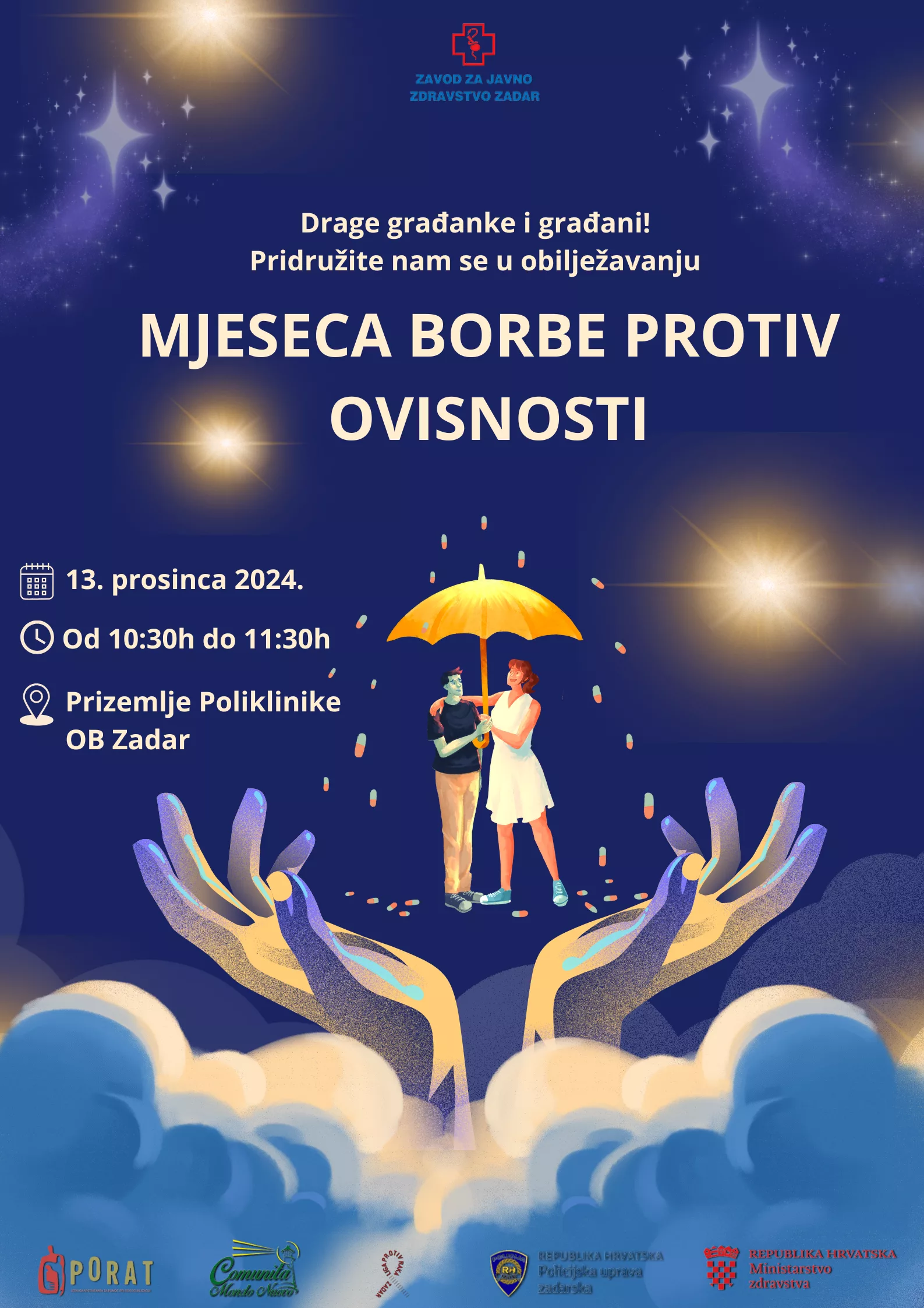 Zavod za javno zdravstvo Zadar Služba za mentalno zdravlje i prevenciju ovisnosti poziva da se pridružite u javnozdravstvenoj akciji povodom obilježavanja Mjeseca borbe protiv ovisnosti u petak od 10:30h do 11:30h u prizemlju Poliklinike OB Zadar.