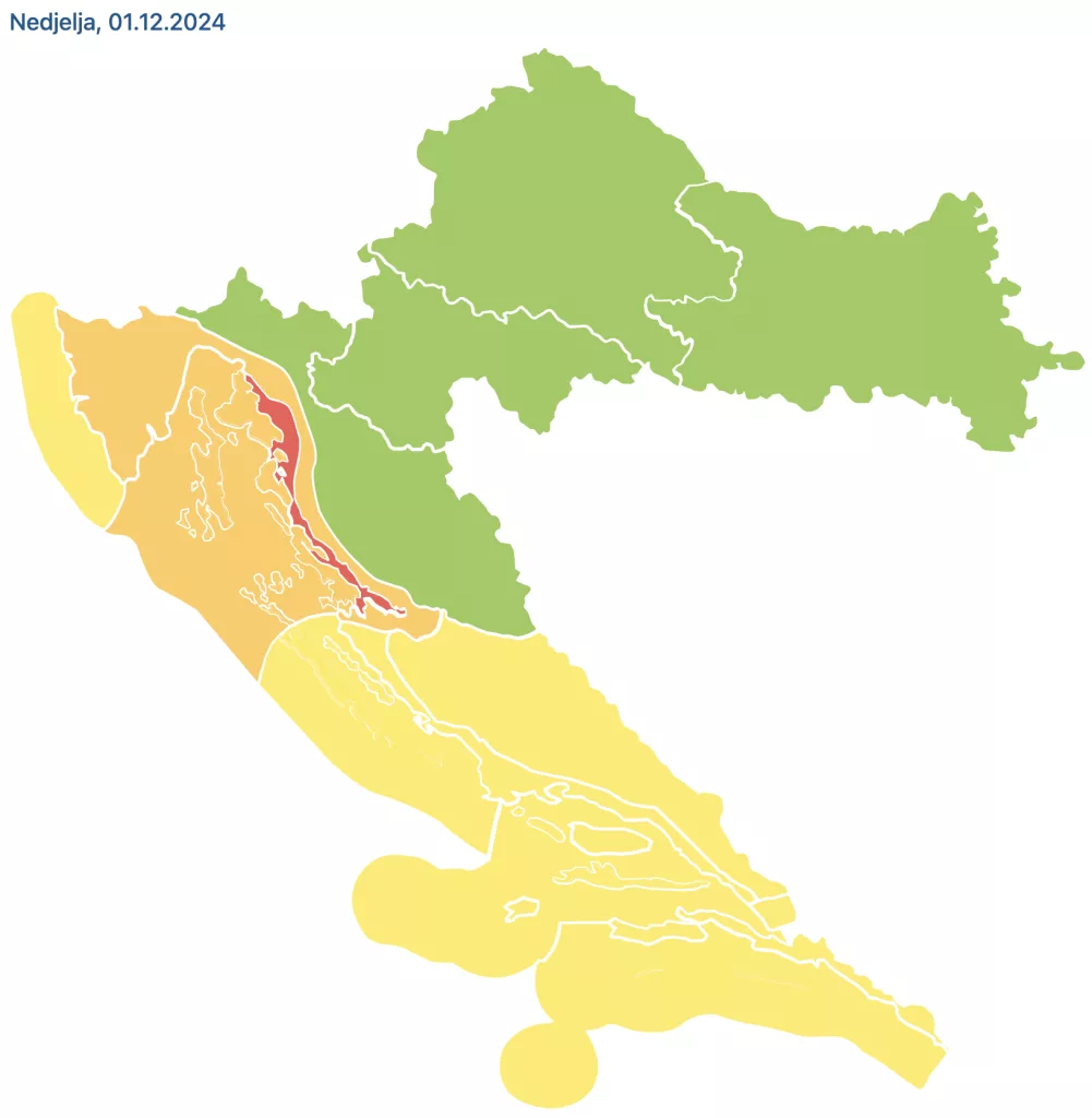 Meteoalarm DHMZ-a poziva na oprez i u nedjelju zbog bure, osobito dakle u noći i prijepodne. Najjača će biti na Kvarneru i u riječkoj regiji, a u područjima pod Velebitom koji su označeni crvenom bojom s udarima i do 160 km/h. Južnije od Zadra je upaljen manji stupanj upozorenja DHMZ-a, s udarima do 90 km/h.