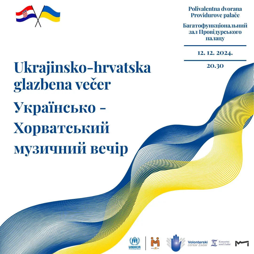 Iz Volonterskog centra Zadar pozivaju na treću po redu Ukrajinsko-hrvatsku glazbenu večer, koja će se održati 12. prosinca u 20.30 sati u Polivalentnoj dvorani Providurove palače na adresi Trg Petra Zoranića 1 Zadar.