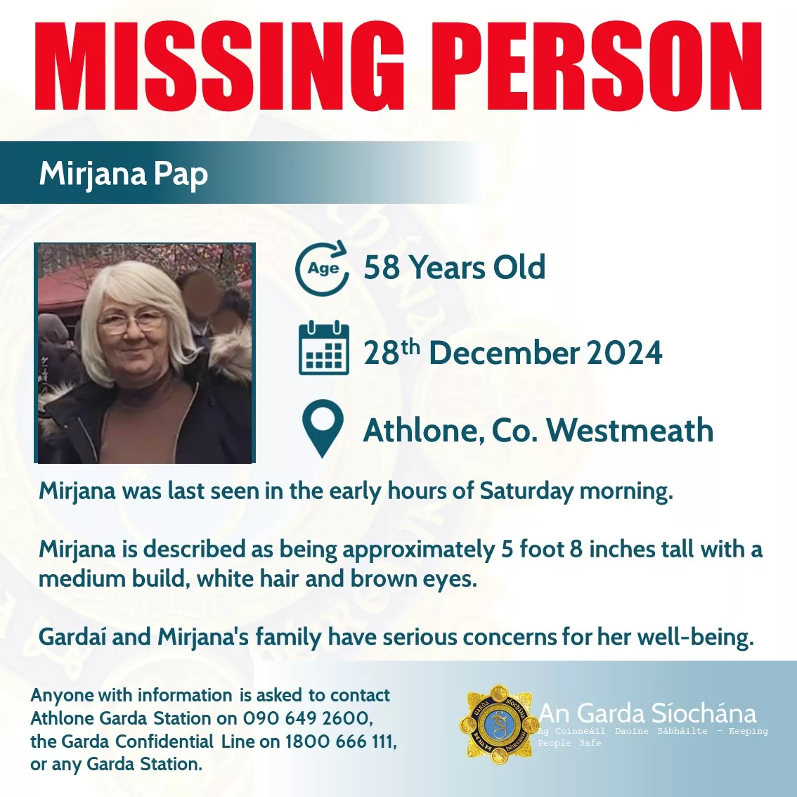 Irska policija Gardaí traži pomoć u pronalasku 58-godišnje Mirjane Pap, koja je u subotu nestala iz svog doma u Athloneu, u Westmeathu. Kako navode, Mirjana je posljednji put viđena u Athloneu u ranim jutarnjim satima subote.