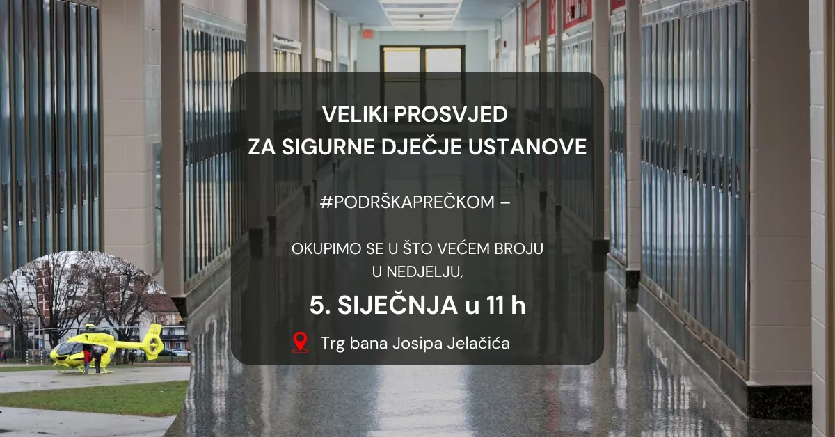 Zato 5. SIJEČNJA okupljamo se na Trgu bana Josipa Jelačića u prosvjedu podrške roditeljima i djeci OŠ Prečko. Tražit ćemo odgovore, rješenja i promjene u sustavu koji mora osigurati sigurnost naše djece. Pozivamo roditelje, učenike, nastavnike, ravnatelje i sve građane da udružimo snage i zahtijevamo bolji sustav koji će omogućiti djeci siguran povratak u škole.