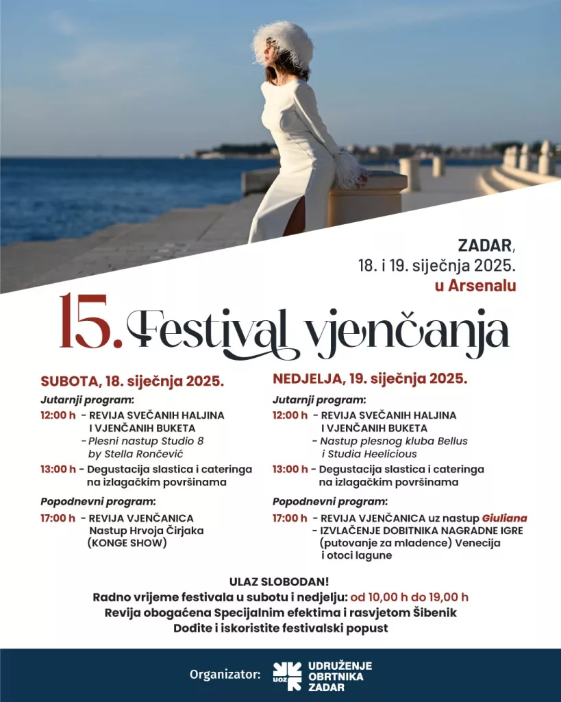 Udruženje obrtnika Zadar organizira 15. Festival vjenčanja, koji će se održati u subotu i nedjelju, 18. i 19. siječnja 2025., u zadarskom Arsenalu.