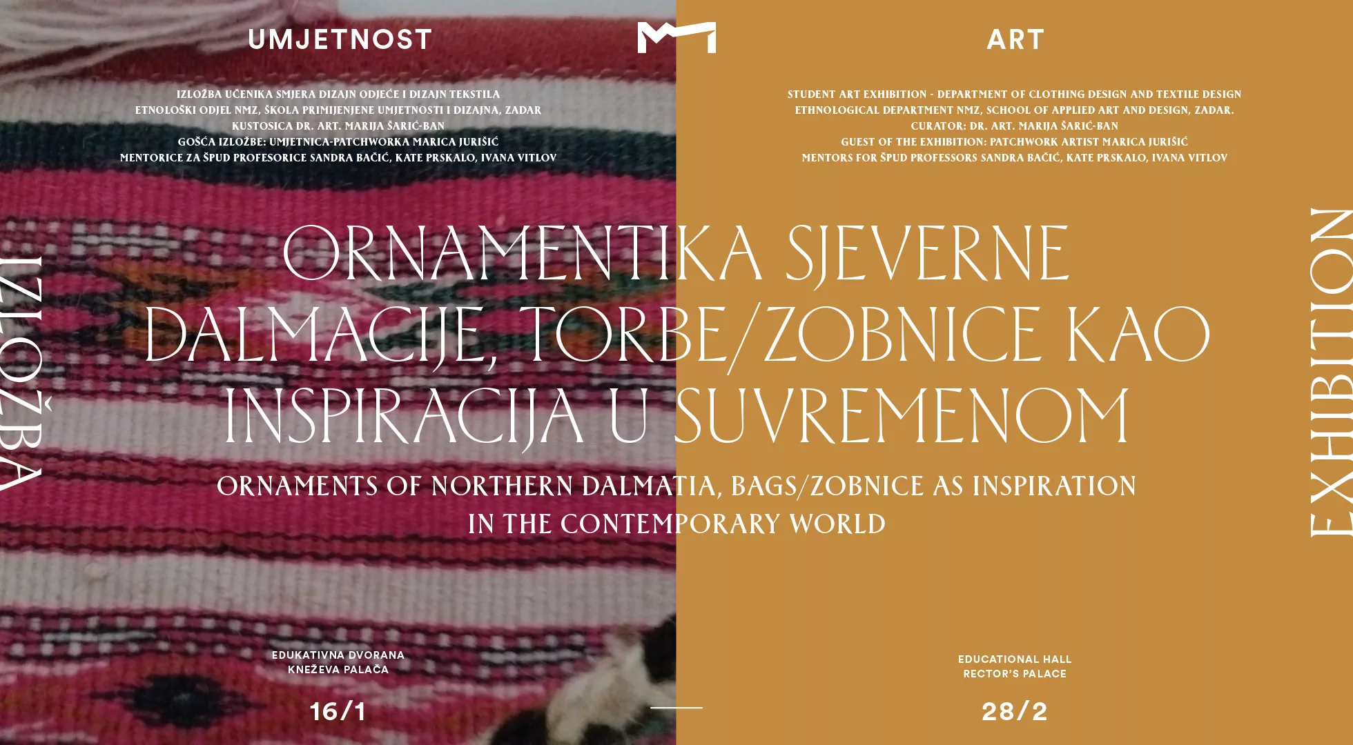 Etnološki odjel Narodni muzej Zadar u suradnji sa Školom primijenjene umjetnosti i dizajna Zadar organizira Izložbu učenika smjera Dizajn odjeće i Dizajn tekstila pod nazivom “Ornamentika sjeverne Dalmacije, torbe/zobnice kao inspiracija u suvremenom”.