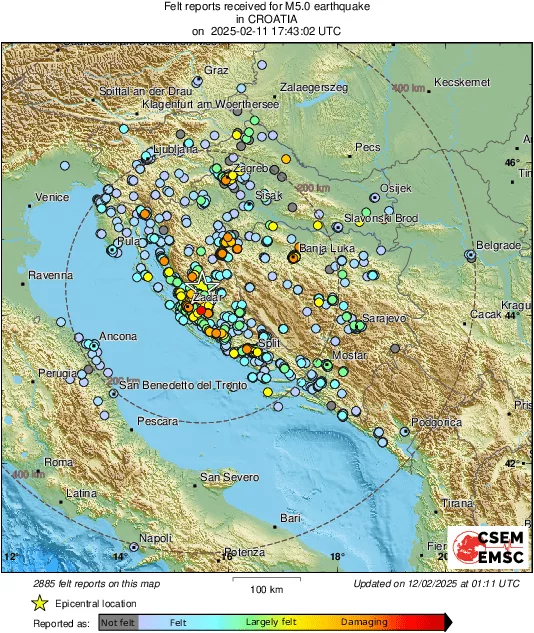 Potres koji je sinoć pogodio zadarsko područje, prema dojavama korisnika EMSC servisa, osjetio se diljem regije.