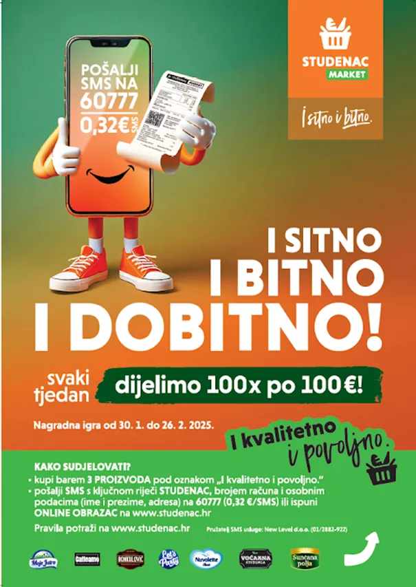 A od 30. siječnja do 26. veljače 2025., Studenac svaku takvu kupnju pretvara u iskustvo koje donosi više – povoljniju kupovinu, kvalitetne proizvode i priliku za nagrade. Nova nagradna igra „I sitno i bitno i dobitno“ nosi priliku da svaki tjedan čak 100 kupaca osvoji kupon od 100 eura.