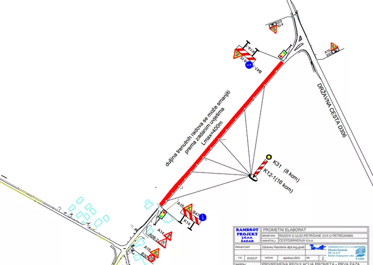 – Obavještavaju se vozači u cestovnom prometu da će zbog izvođenja radova društva Cestogradnja d.o.o. na rekonstrukciji prometnice u Petrčanima u Ulici XXX i to od raskrižja s državnom cestom D306 do Gornjih Petrčana, od dana 10. veljače 2025. (ponedjeljak) s početkom u 9,00 sati do 15. lipnja 2025. na snazi biti privremena regulacija prometa. Za vrijeme izvođenja radova promet će se odvijati naizmjenično jednim prometnim trakom pomoću prometnih svjetla (semafora). Pozivamo sve sudionike u prometu na strpljenje i poštivanje znakova privremene regulacije prometa, navodi se u obavijesti objavljenoj na stranicama Grada Zadra.