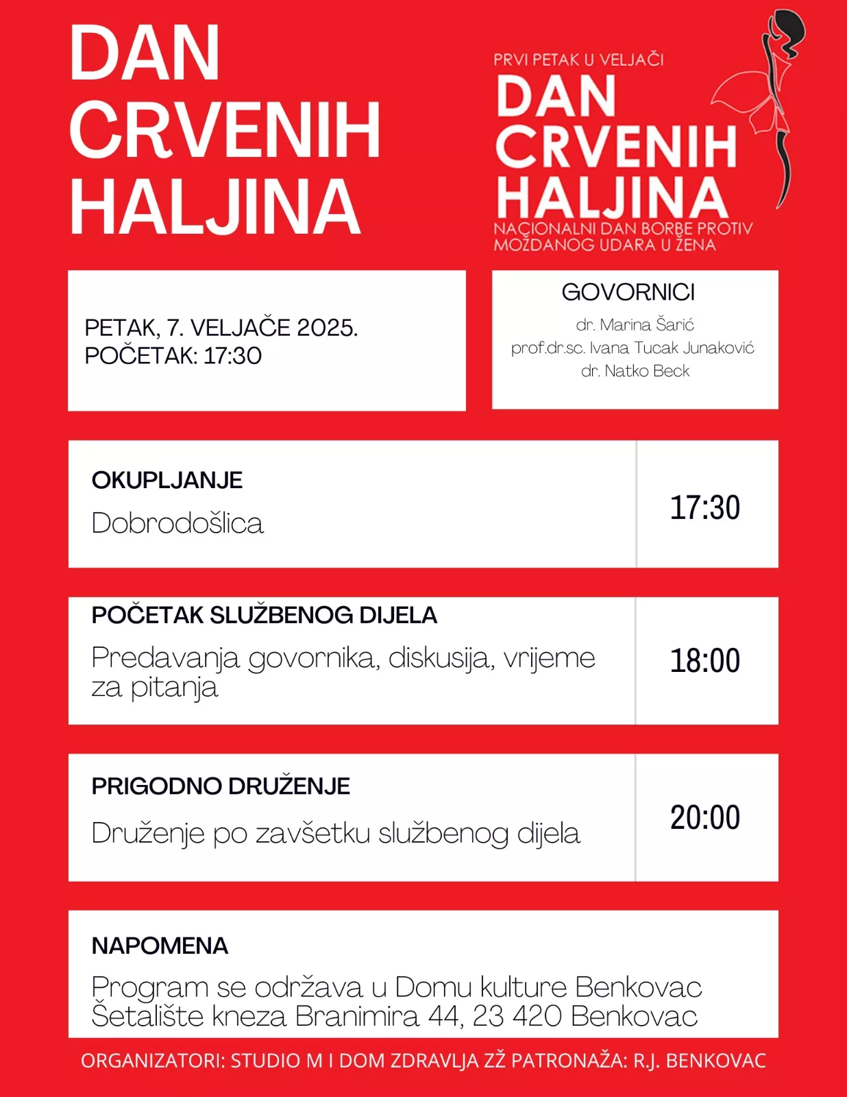 U organizaciji STUDIA M Benkovac, Doma zdravlja Zadarske županije, Službe patronažne zdravstvene zaštite – Radna jedinica Benkovac održat će se obilježavanje Dana crvenih haljina, međunarodne kampanje koja se provodi u pedesetak zemalja diljem svijeta s ciljem podizanja svijesti o moždanom udaru kod žena.