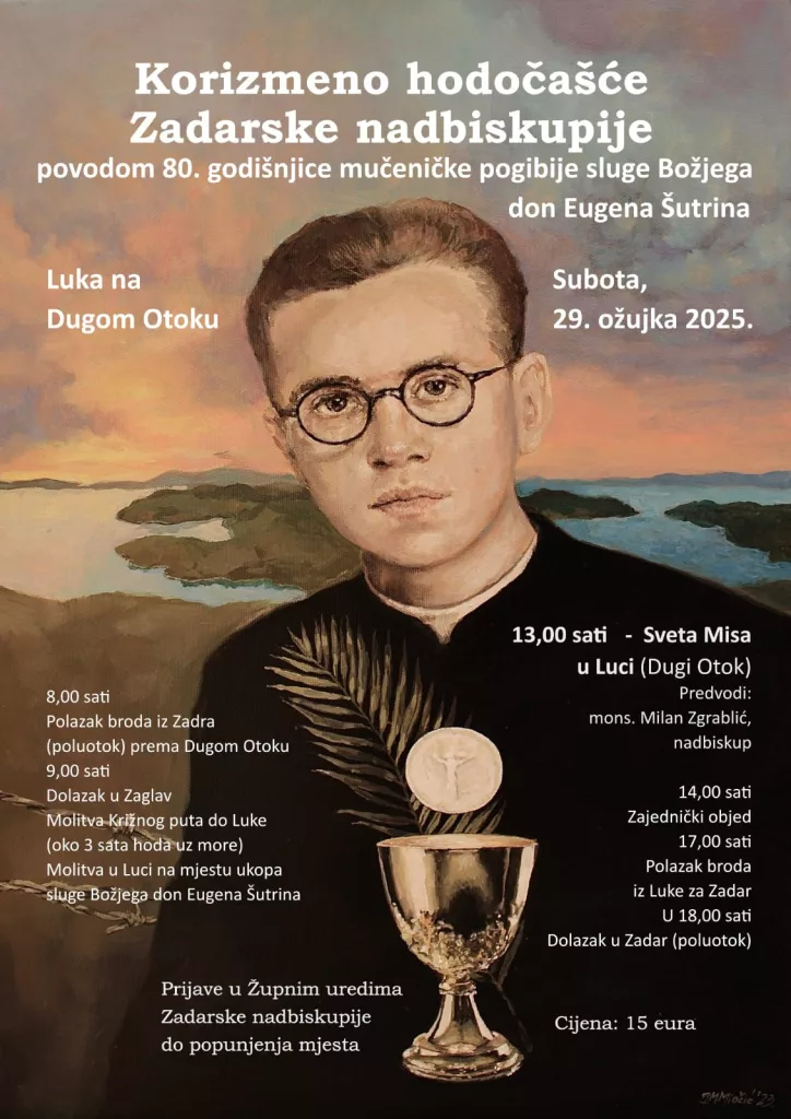 Zadarska nadbiskupija uputila je poziv vjernicima mjesne Crkve da sudjeluju na Korizmenom hodočašću Zadarske nadbiskupije u Luku na Dugom otoku, rodno mjesto Sluge Božjega don Eugena Šutrina (Luka, 1914. – Privlaka 1945.), koje će se održati u subotu, 29. ožujka.