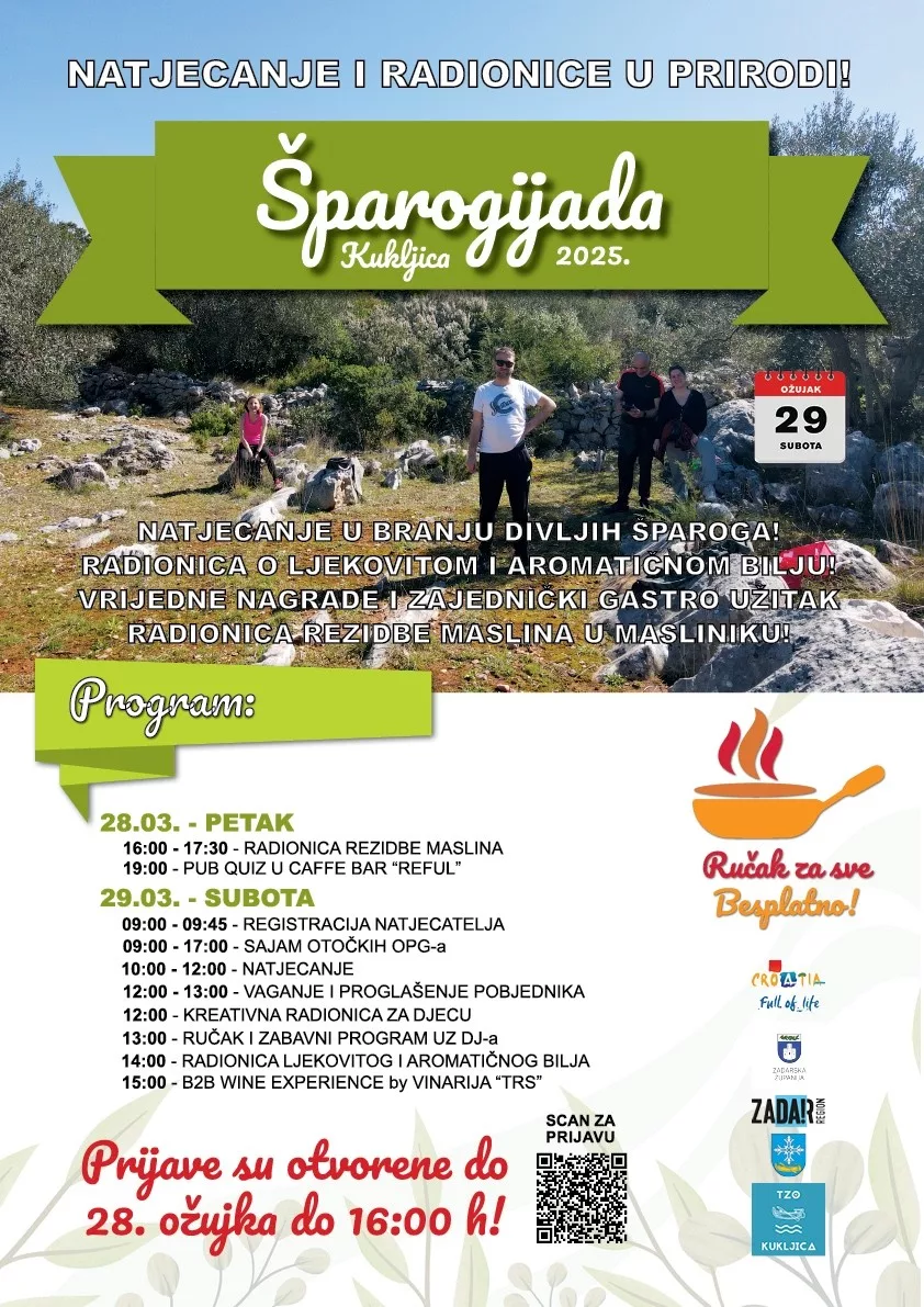 Šparogijada Kukljica predstavlja savršenu priliku za sve zaljubljenike u prirodu i gastronomiju da se okupe, natječu, educiraju i uživaju u otočnim okusima i mirisima. Prijave su otvorene do 28. ožujka do 16:00 sati, a svi zainteresirani mogu se prijaviti putem poveznice: https://forms.gle/